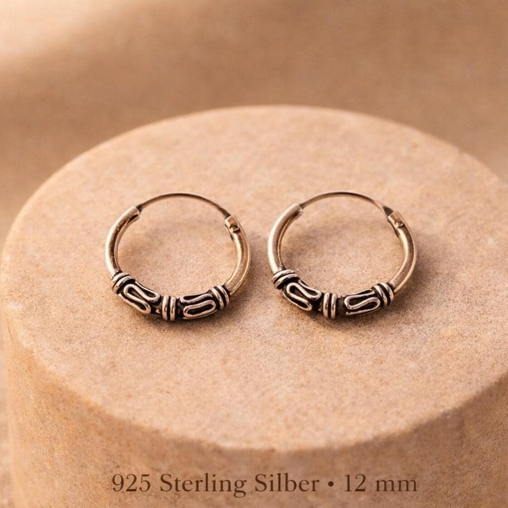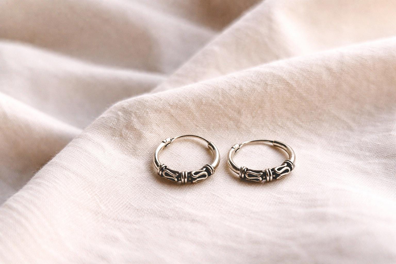 The small hoop earrings are crafted with meticulous detail and display the characteristic, slightly structured shape of traditional Bali earrings.
