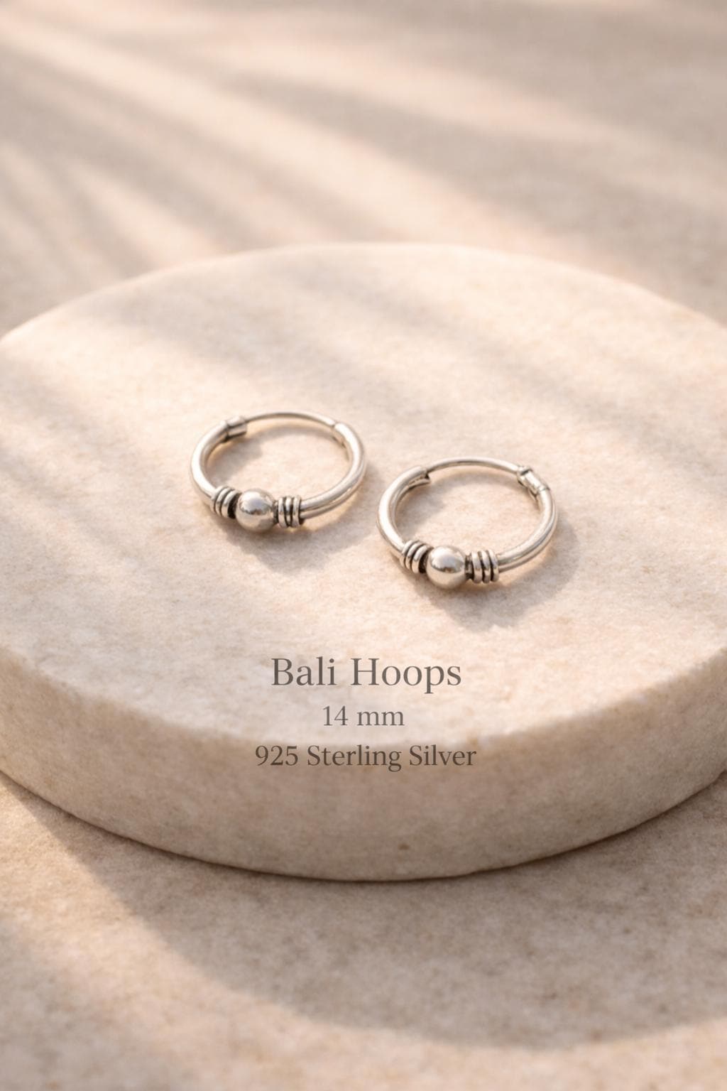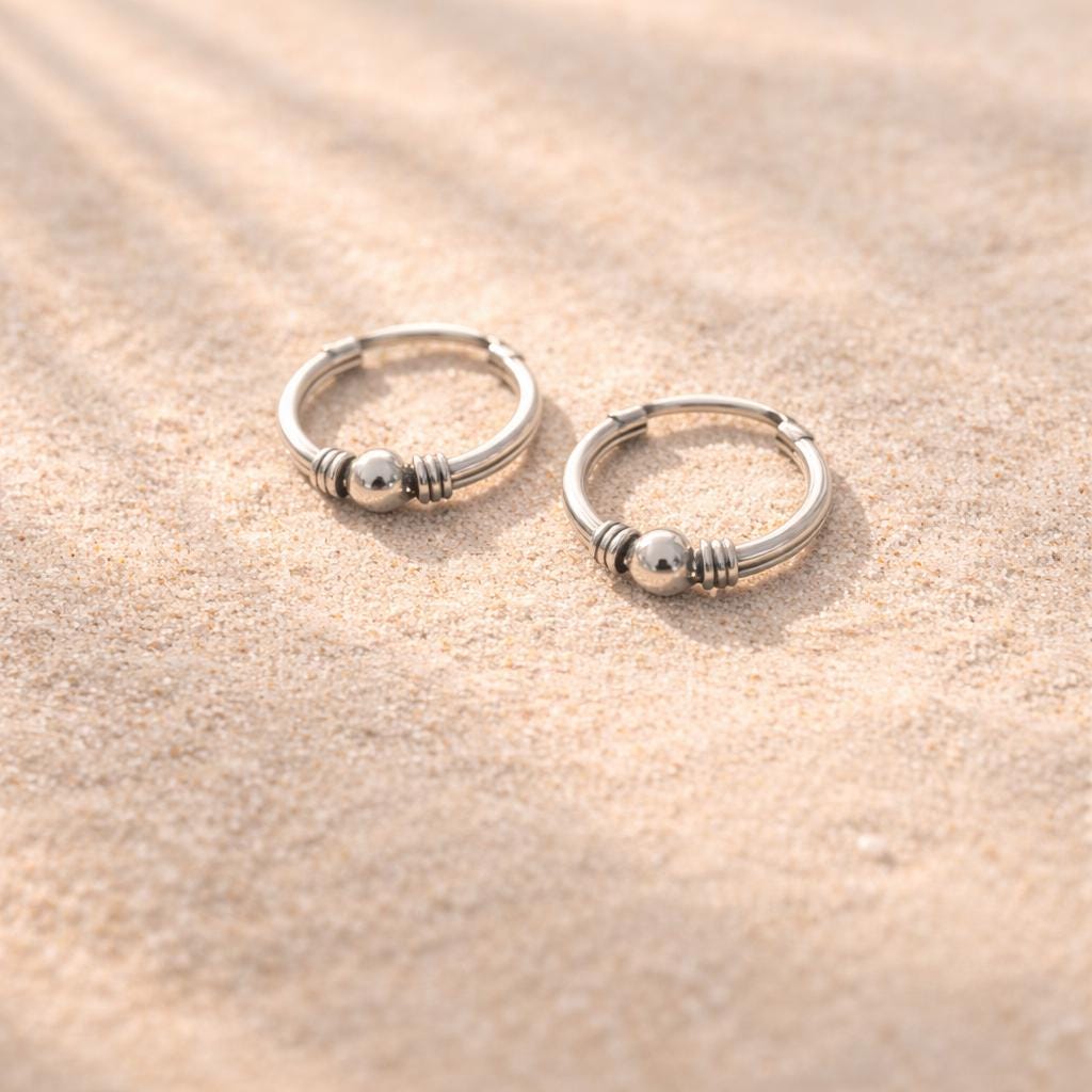 Delicate Bali earrings in 925 sterling silver. These small hoops are meticulously crafted and feature the characteristic, subtly textured shape of traditional Bali earrings. Lightweight and comfortable to wear, they are ideal for everyday use.