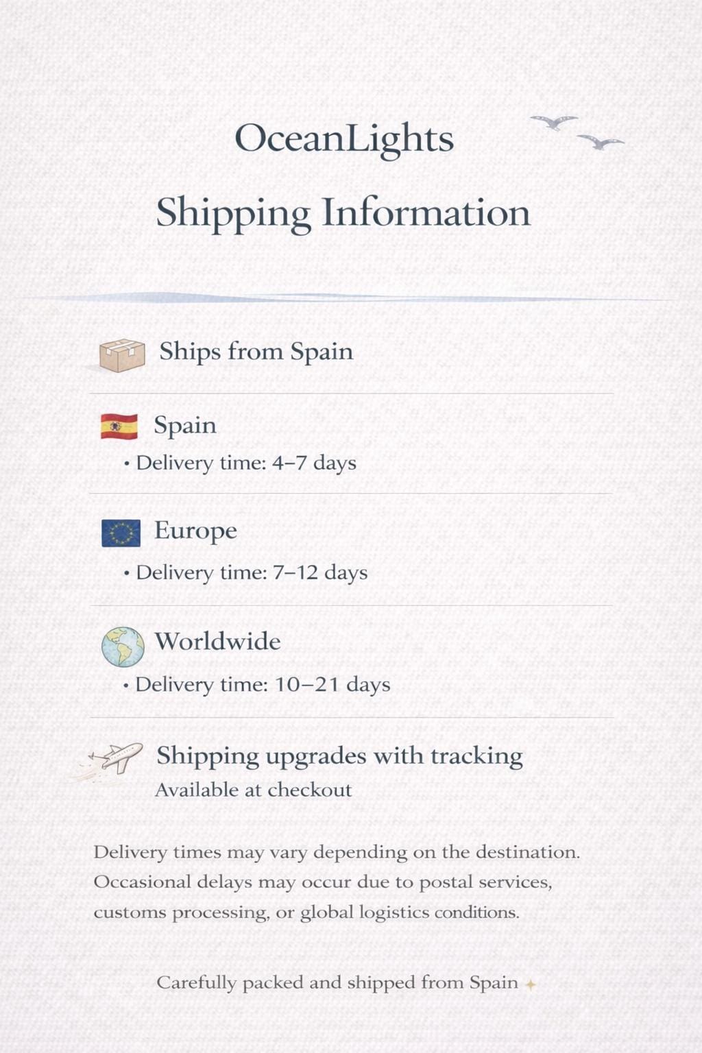 Your order will be carefully packaged and shipped from Spain. The delivery times displayed by Etsy are estimates and may vary slightly.