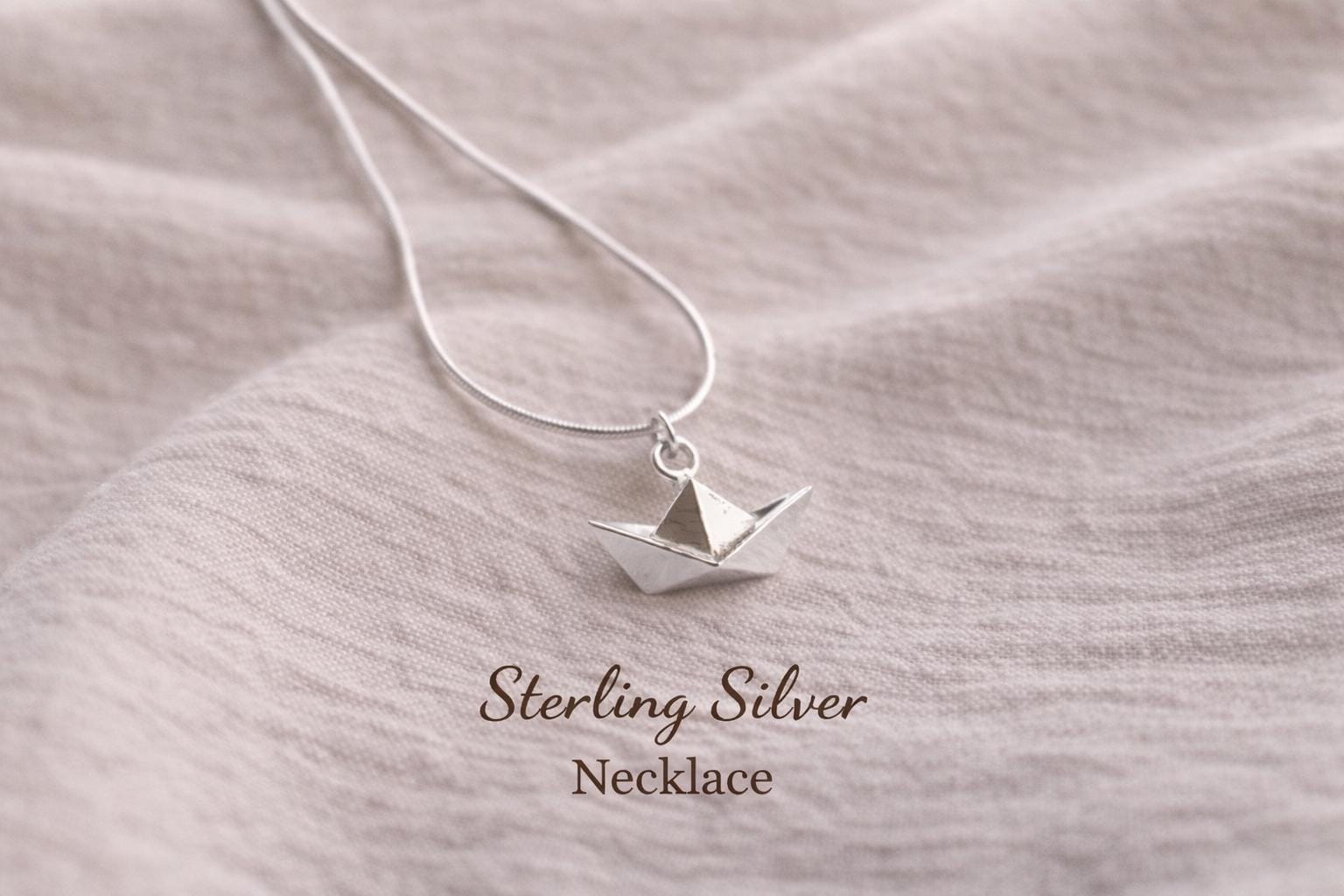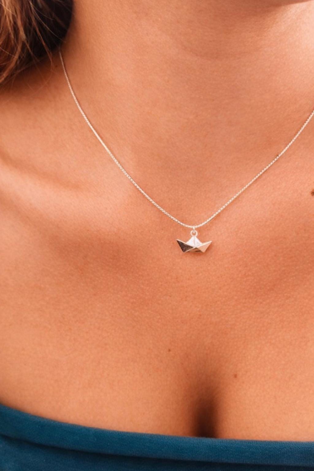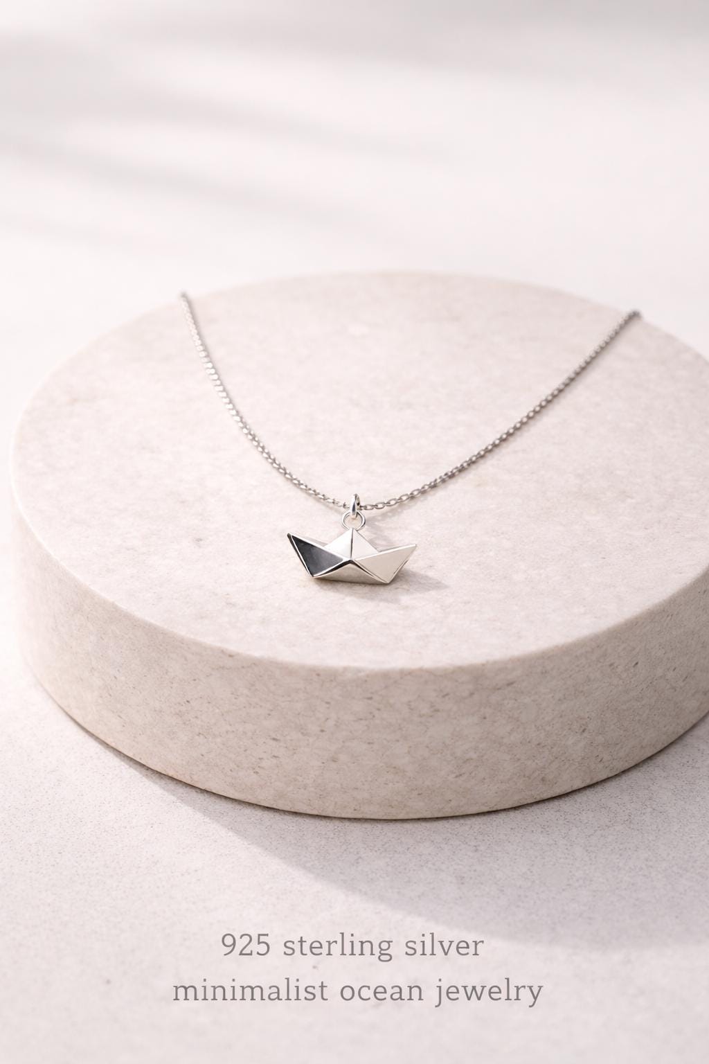 This origami boat necklace in sterling silver is a piece of minimalist ocean jewelry, designed as a meaningful gift for her.