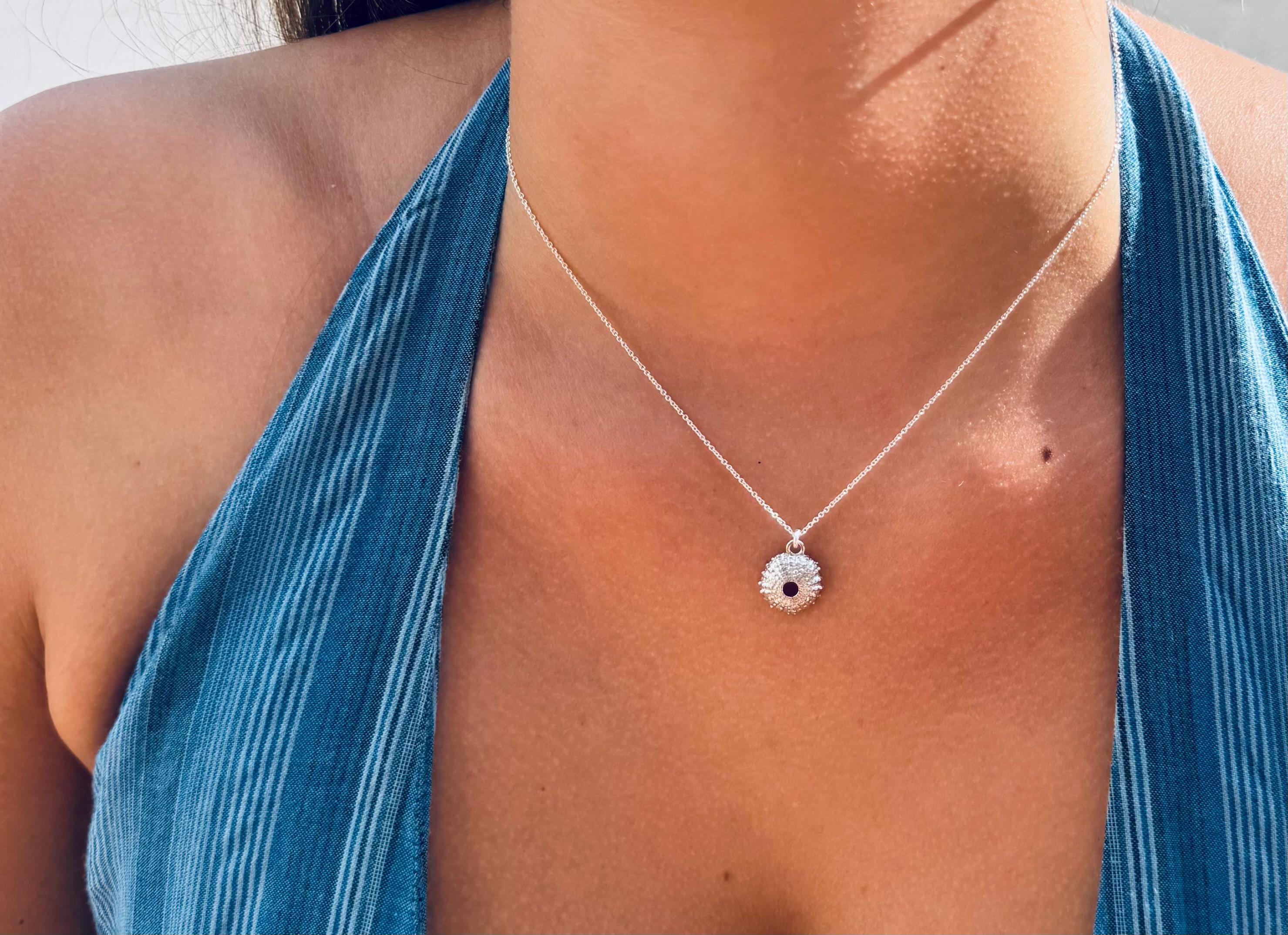 Dainty necklace with a small sea urchin pendant made of high-quality 925 Sterling Silver. The chain is available in three lengths – 40 cm, 45 cm, or 50 cm – and comes with a 3 cm extender. You can also choose between a classic anchor chain and an elegant snake chain. The pendant measures 15.7 mm x 13 mm.