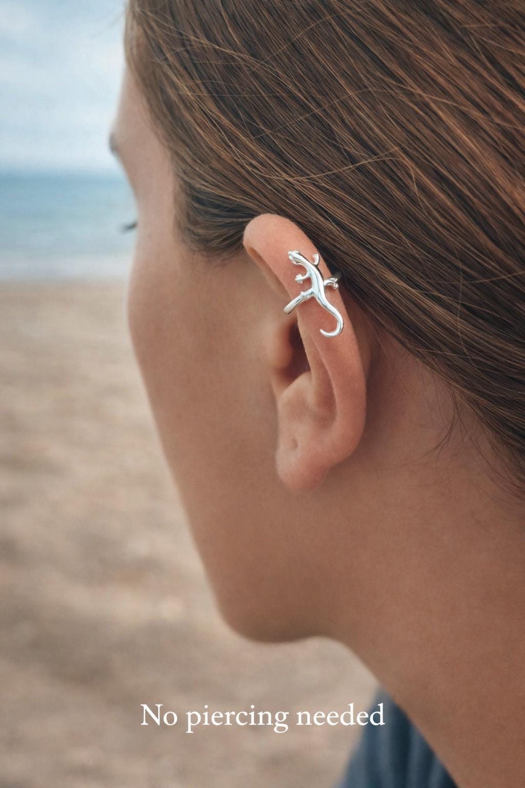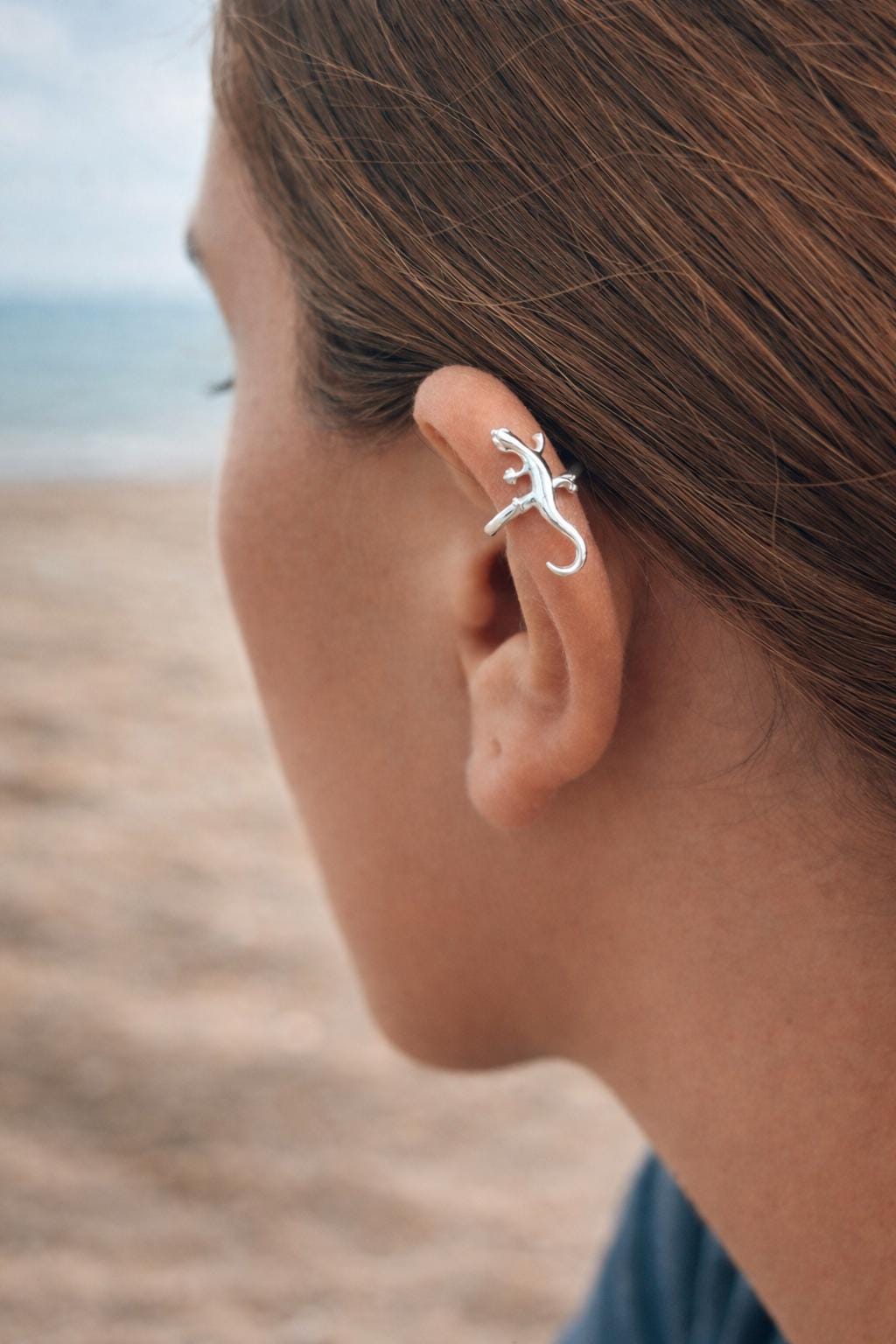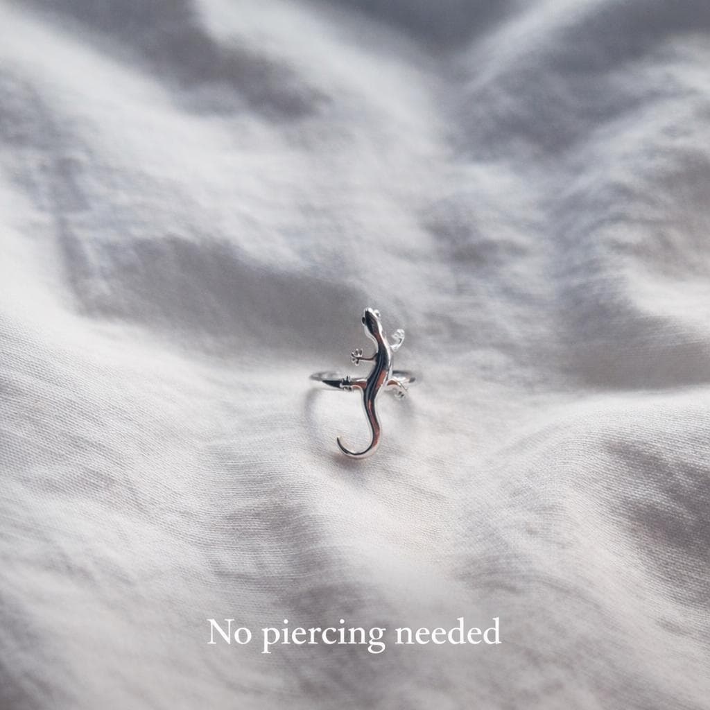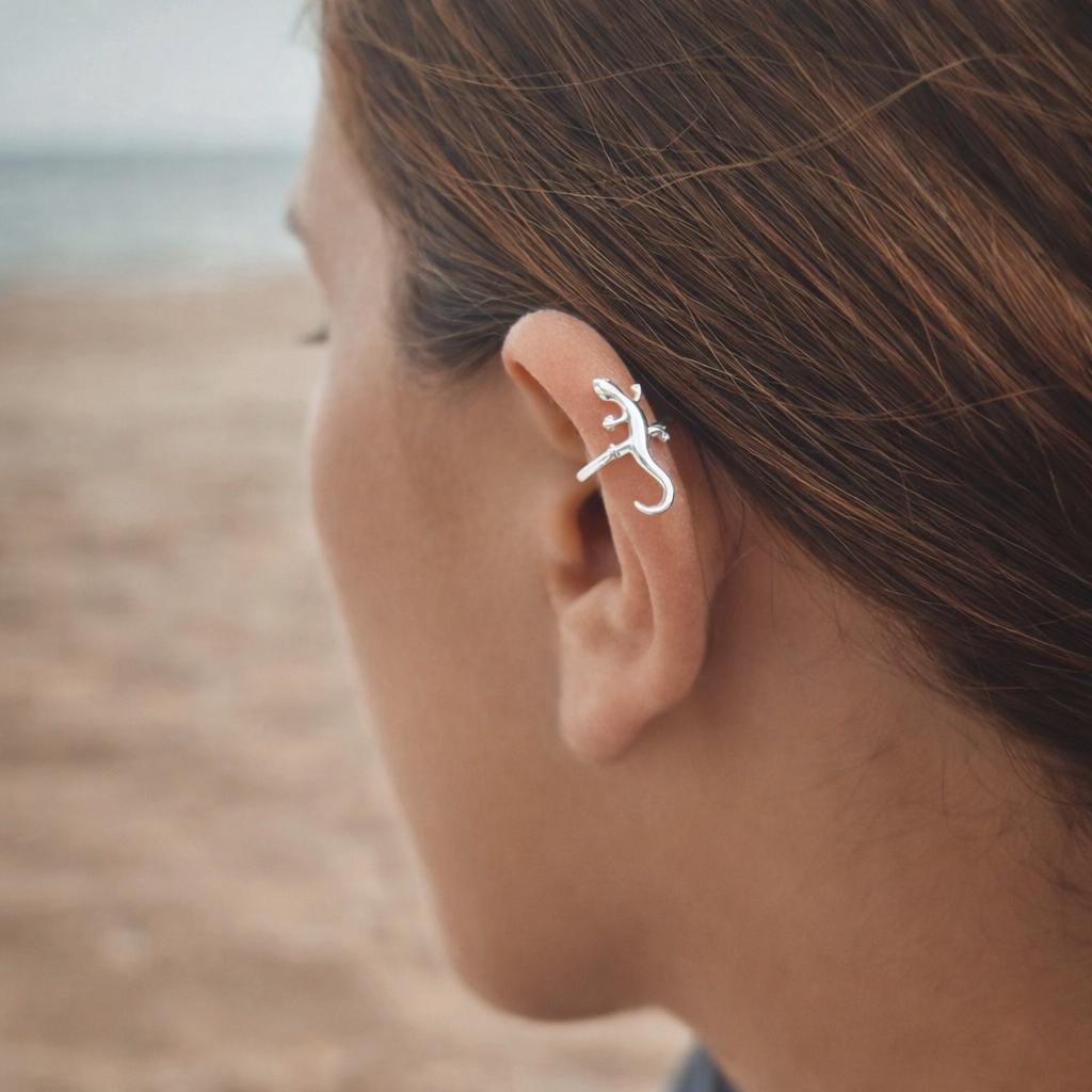 This delicate gecko ear cuff is a unique piece of jewelry for those who love minimalist and modern designs. It attaches easily to the ear without piercing and can be gently adjusted for a secure and comfortable fit.