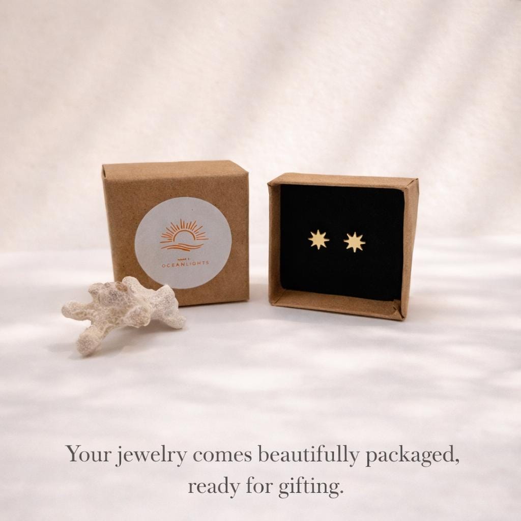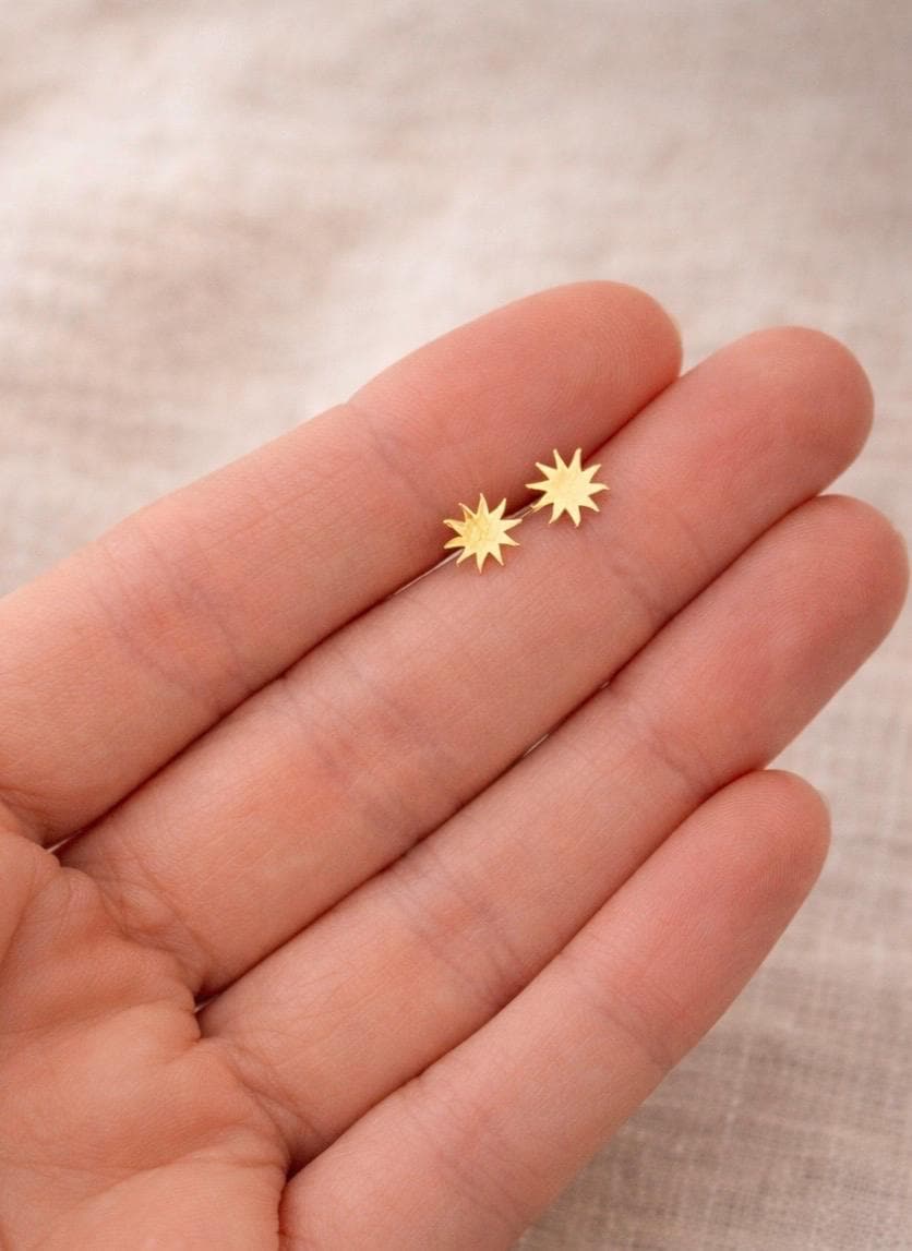 Delicate gold-plated stud earrings with a small sun – a minimalist design symbolizing warmth and light. A special piece of jewelry that brings a touch of sunshine even on gray winter days – ideal as a thoughtful gift for women who appreciate naturalness and minimalist design.