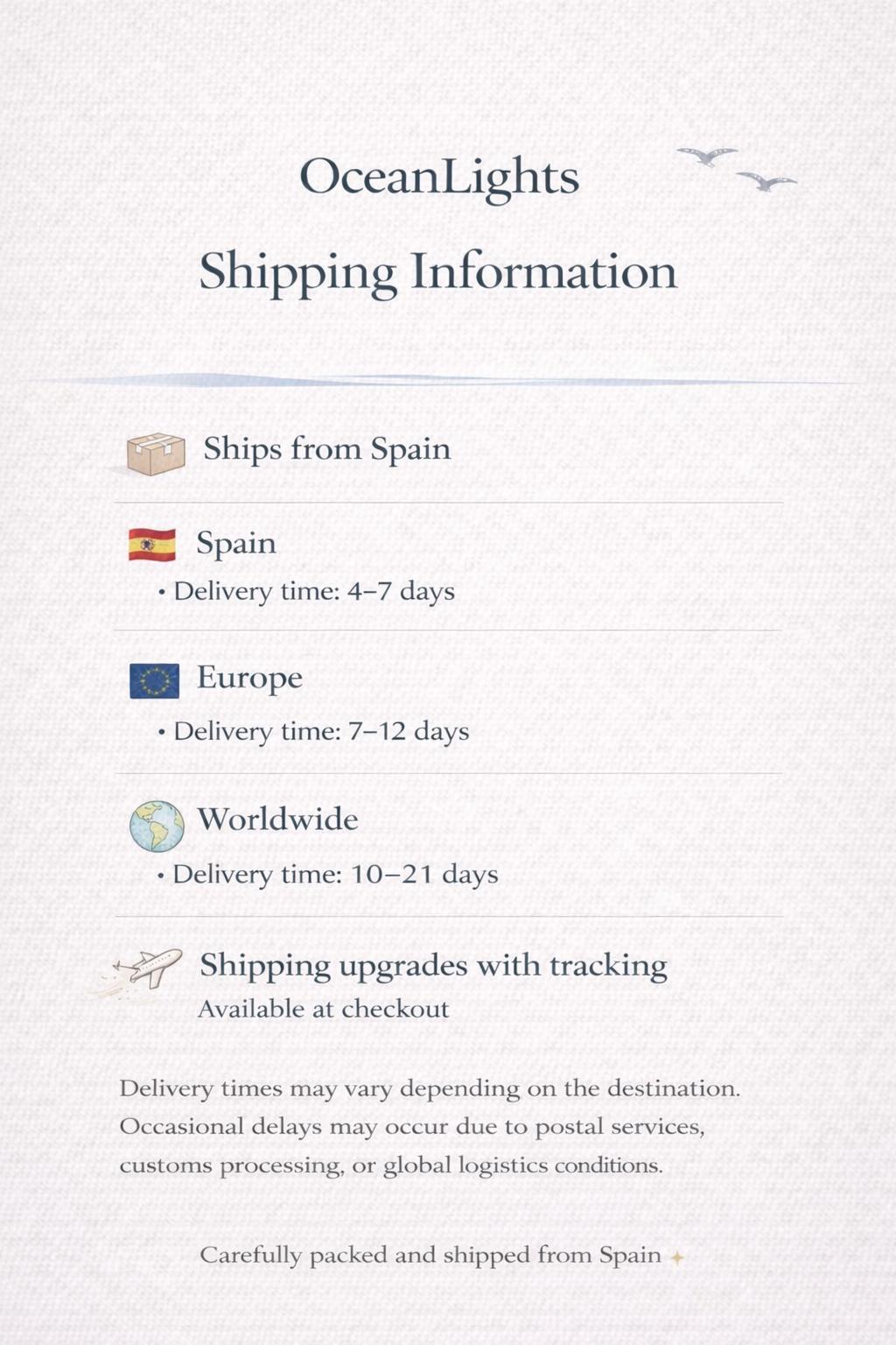Your order will be carefully packaged and shipped from Spain. The delivery times shown on Etsy are estimates and may vary slightly.