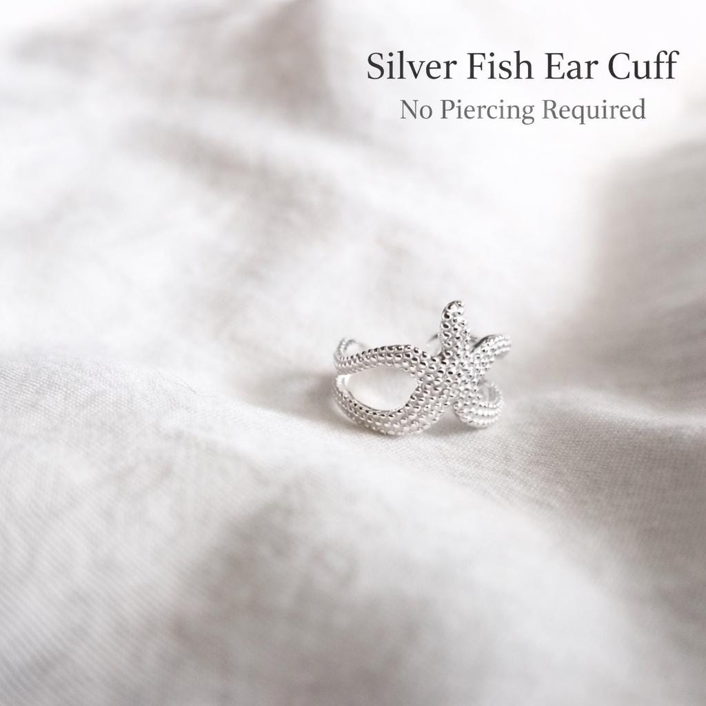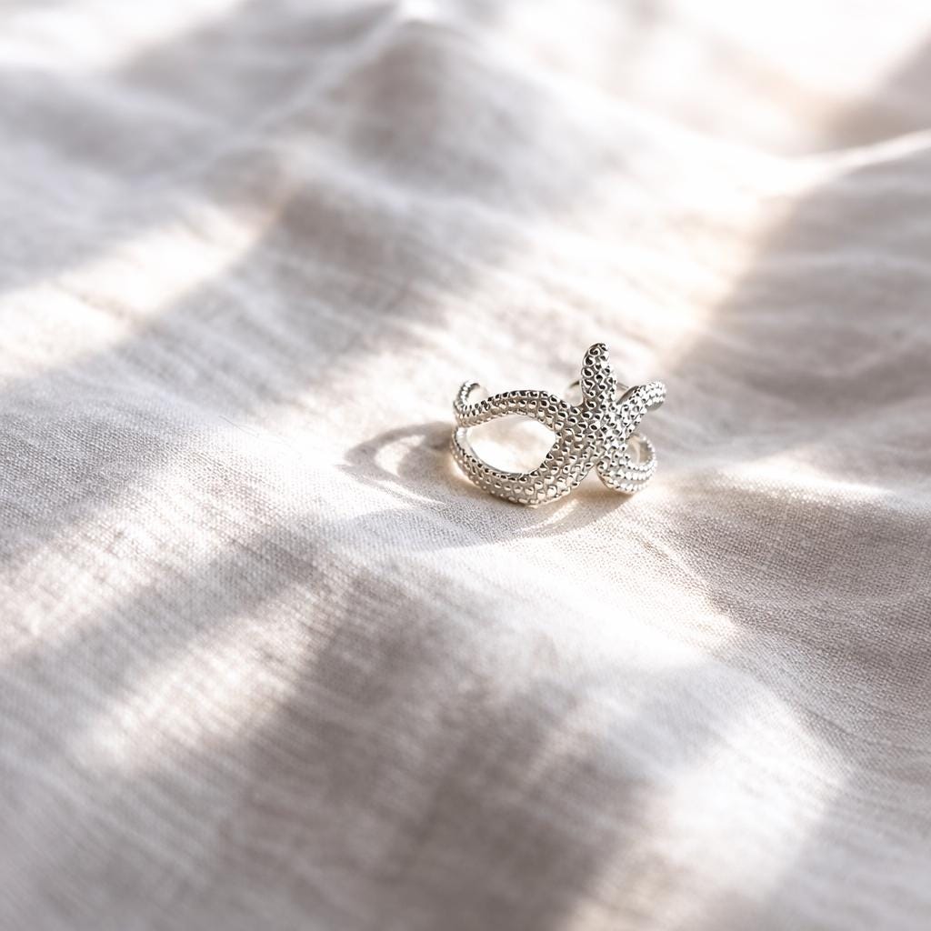 Starfish ear cuff in 925 sterling silver - minimalist ocean jewelry and a thoughtful gift idea for anyone who loves the ocean. This delicate starfish ear cuff is a subtle statement piece for those who feel connected to the sea. The intricate design, crafted from genuine 925 sterling silver, nestles gently against your ear – no piercing required. The starfish symbolizes new beginnings, strength, and inner peace – exactly what one associates with the ocean.
