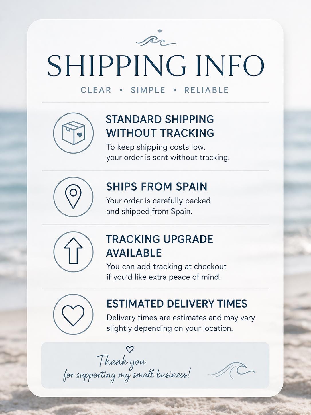 Your order will be carefully packaged and shipped from Spain. The delivery times shown on Etsy are estimates and may vary slightly.