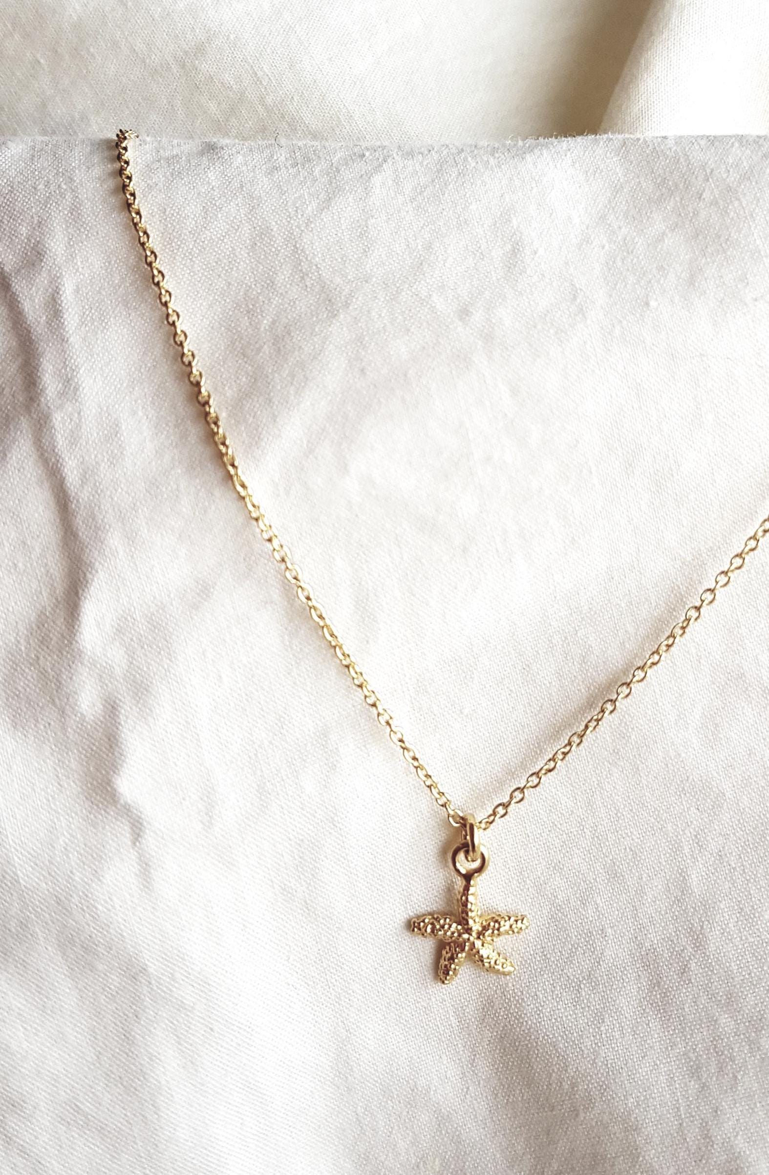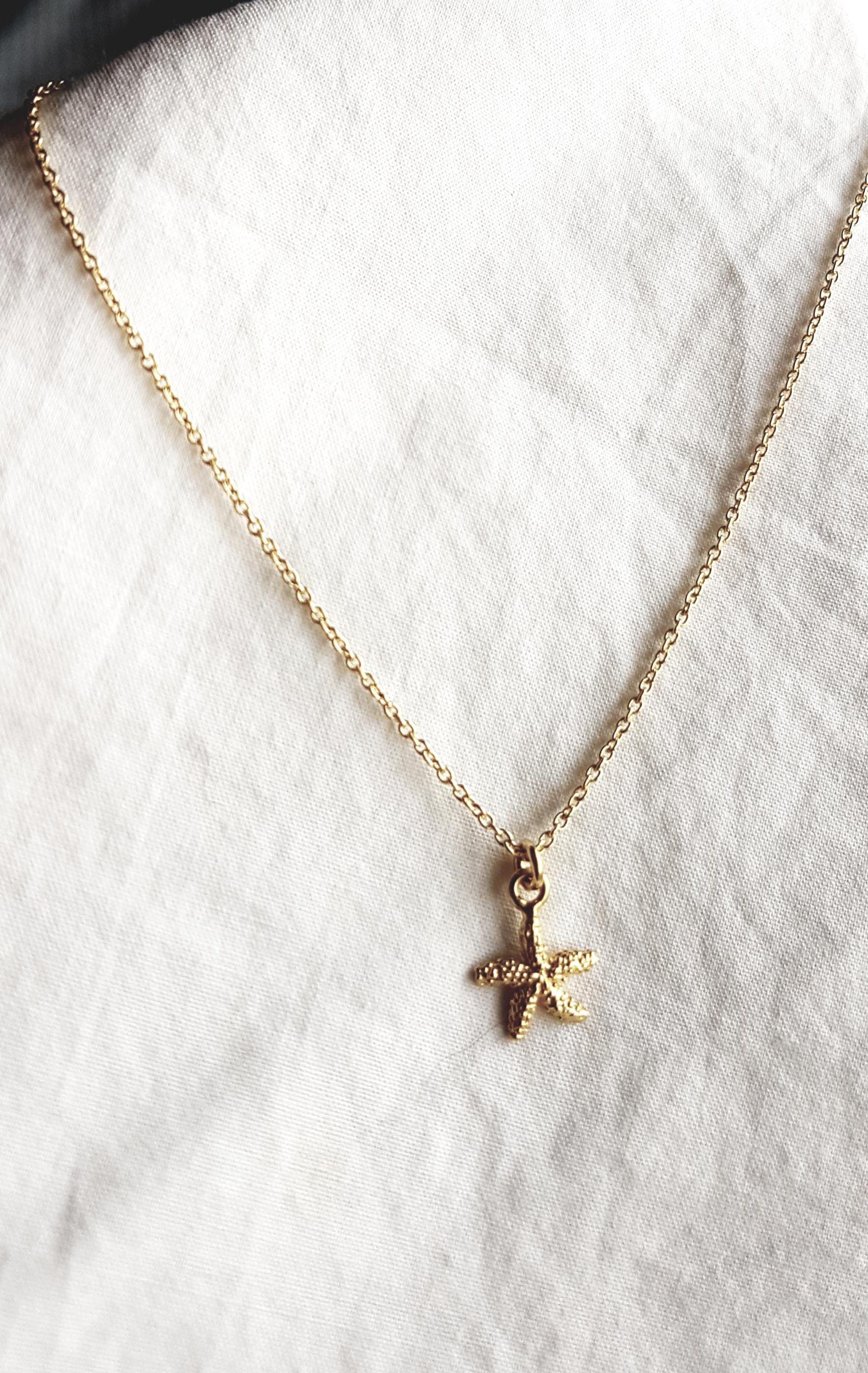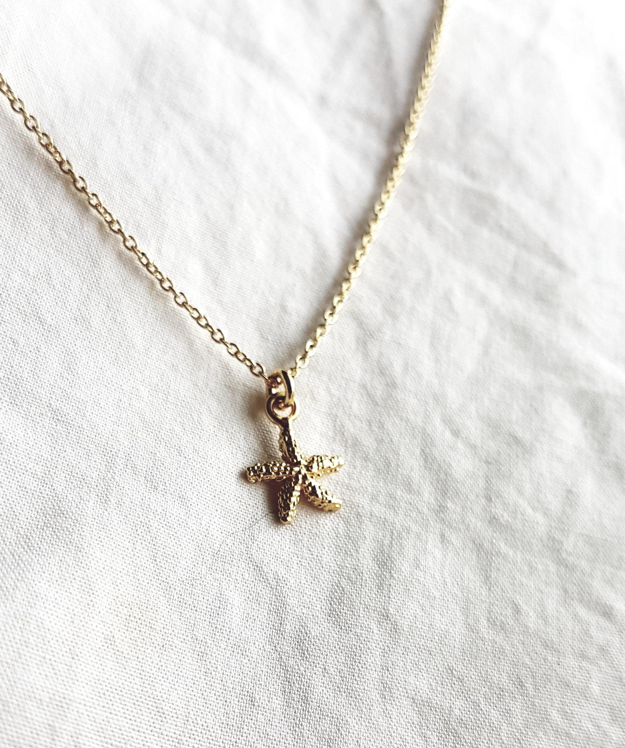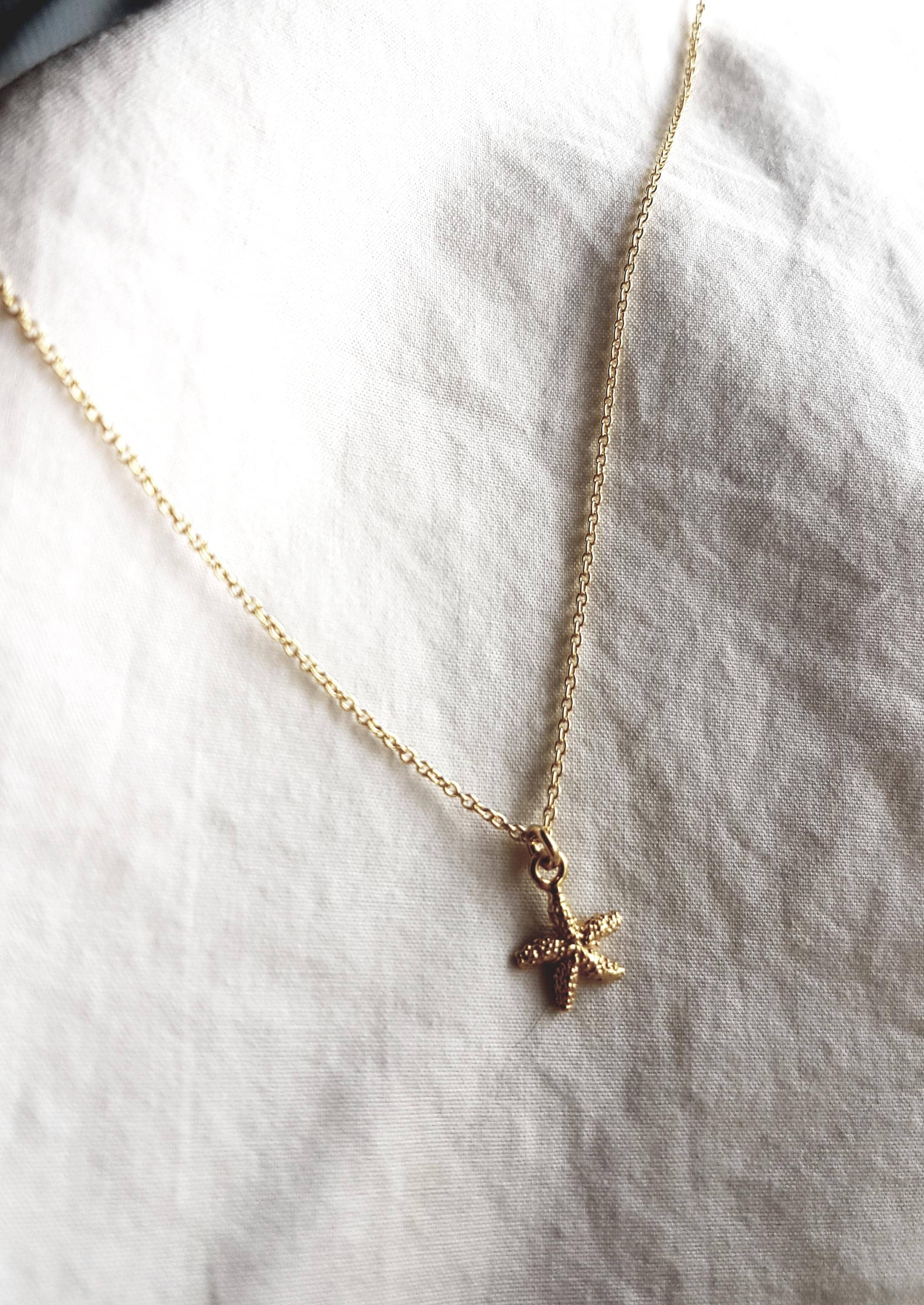 A delicate necklace with a small starfish made of high-quality 925 sterling silver with 24-karat multi-layer gold plating. The chain is available in lengths of 40 cm, 45 cm, or 50 cm and comes with a 3 cm extension. The piece is coated with two layers of gold—a base layer and a top layer, which increases the durability of the plating. The pendant measures 10 mm.