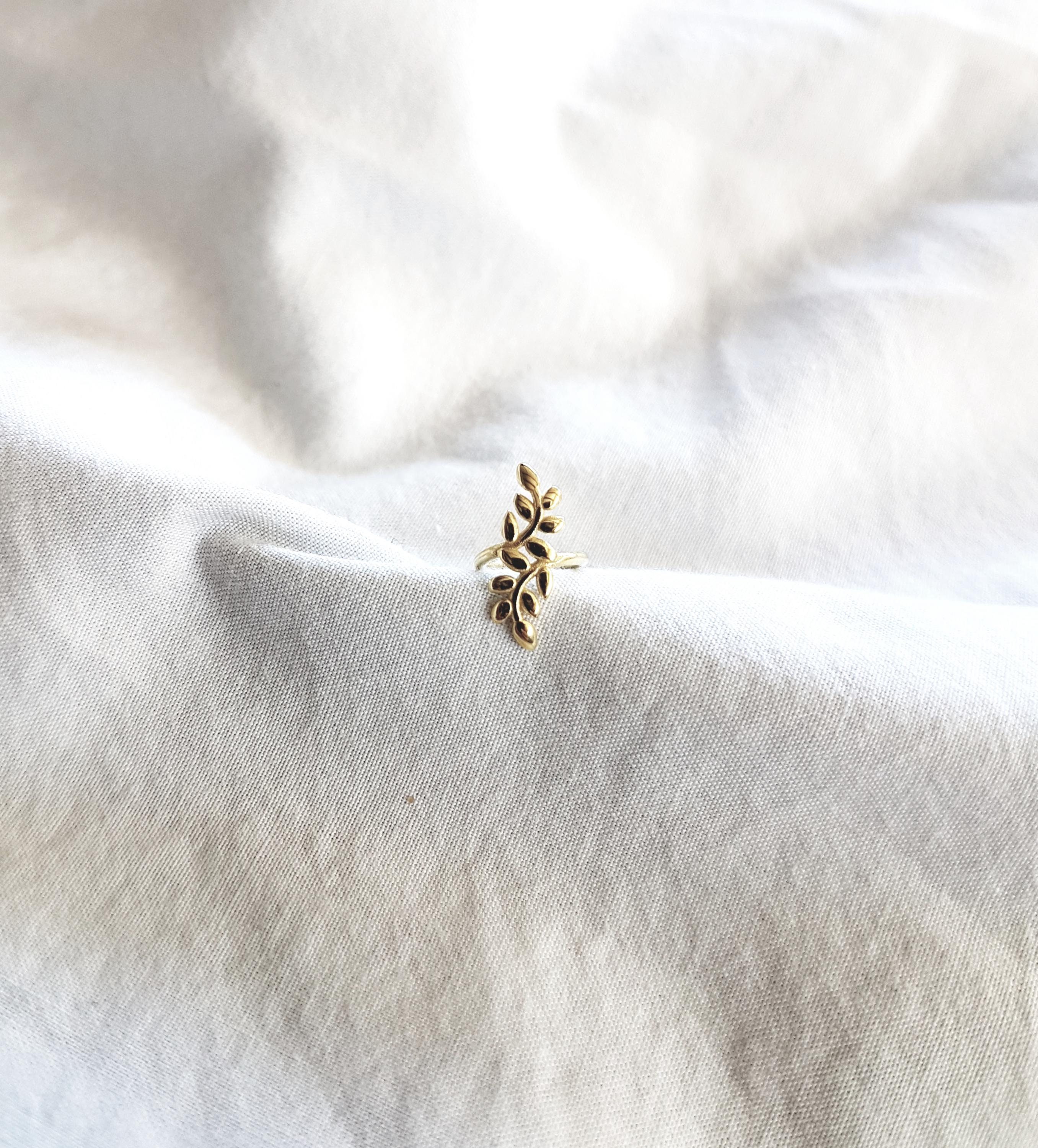 The ear cuff is made of 925 sterling silver and plated with 14-karat gold. It measures 8.8 mm. No piercing is required to wear it! This ear cuff simply clips onto the outer, upper, or middle part of the ear and can be adjusted to your liking with a little pressure.