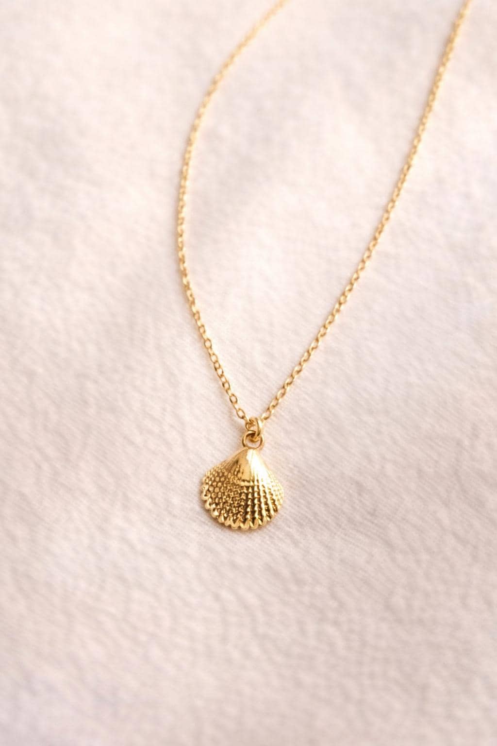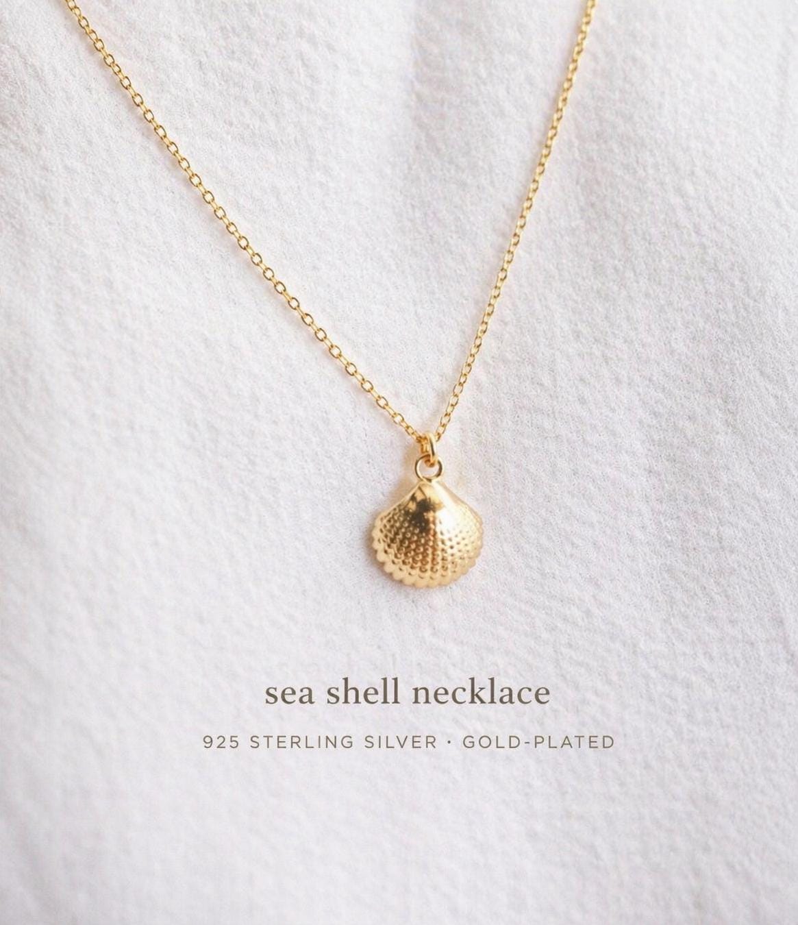 A delicate shell necklace made of gold-plated 925 sterling silver. The pendant is crafted with meticulous detail – featuring a fine surface texture and natural shape.