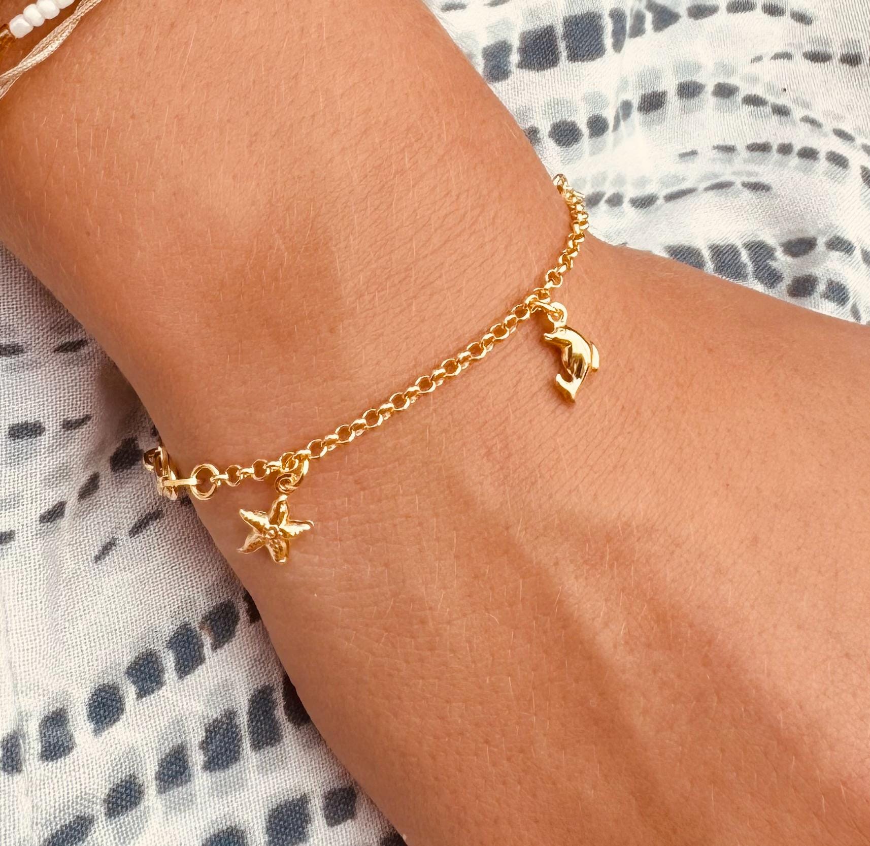 This fine, gold-plated bracelet made of genuine 925 Sterling Silver is decorated with lovingly designed pendants – a dolphin, starfish, and shell. It's the perfect gift for anyone who loves the sea.