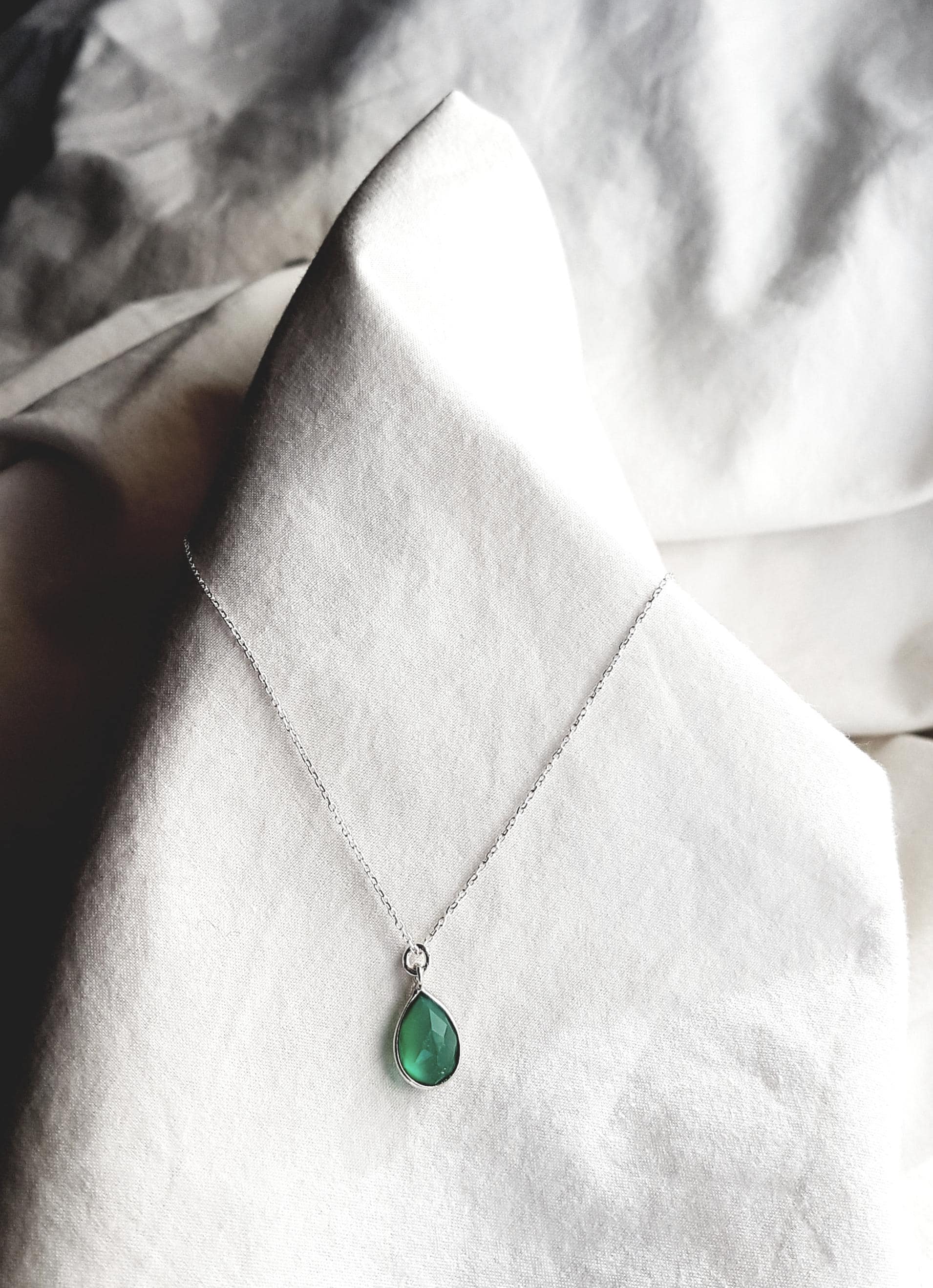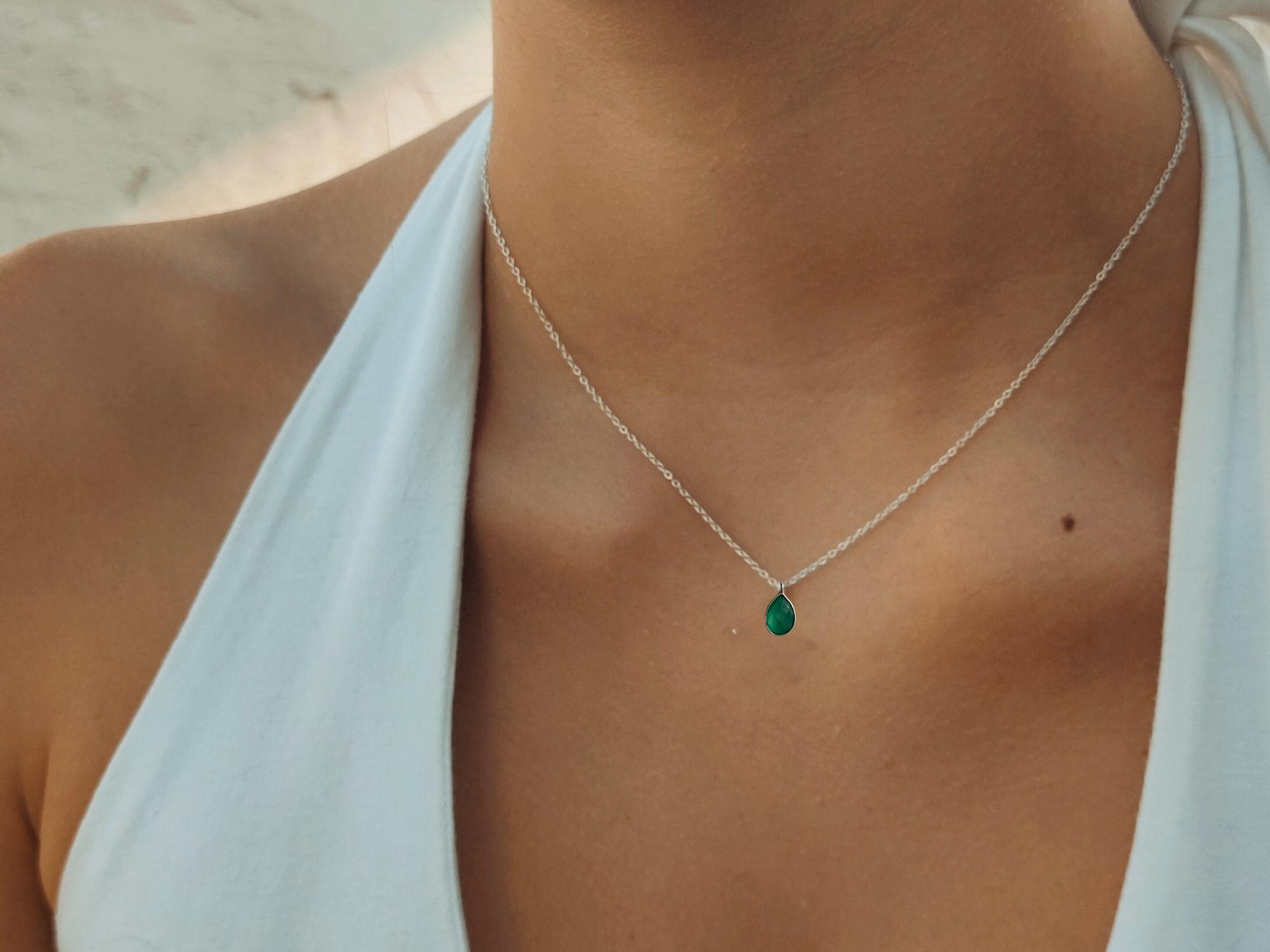 A delicate silver necklace featuring a faceted green teardrop pendant with an elegant emerald-inspired glow.