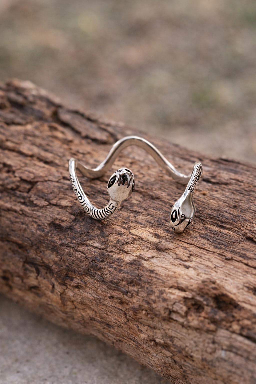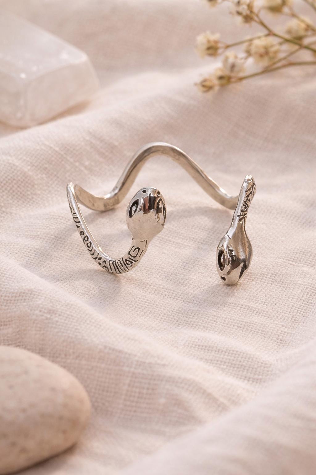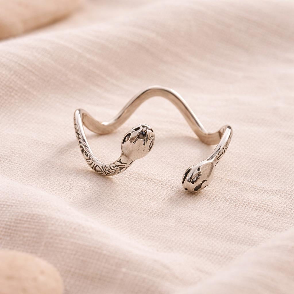 The two finely crafted snake heads give the ring an elegant, slightly organic shape that gently hugs the finger.
