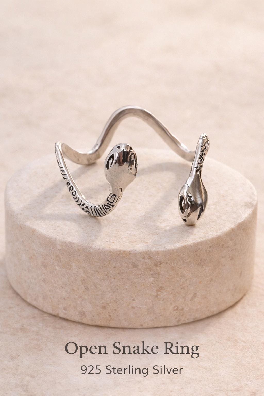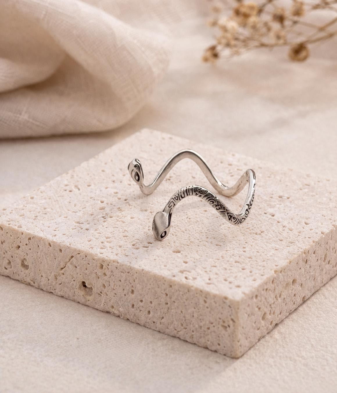 A minimalist open snake ring crafted from 925 sterling silver, designed to gently wrap around your finger. Its organic shape and subtle details make it a timeless piece that adds a meaningful touch to everyday styling.