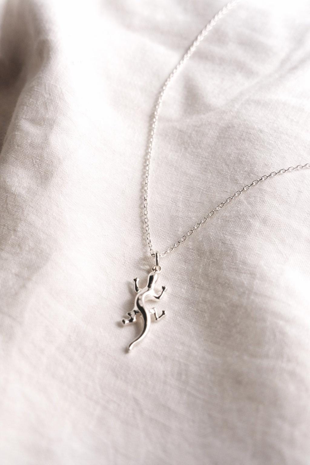 Delicate sterling silver necklace with a gecko pendant – a minimalist piece of jewelry that is also considered a protective symbol and lucky charm in many cultures.