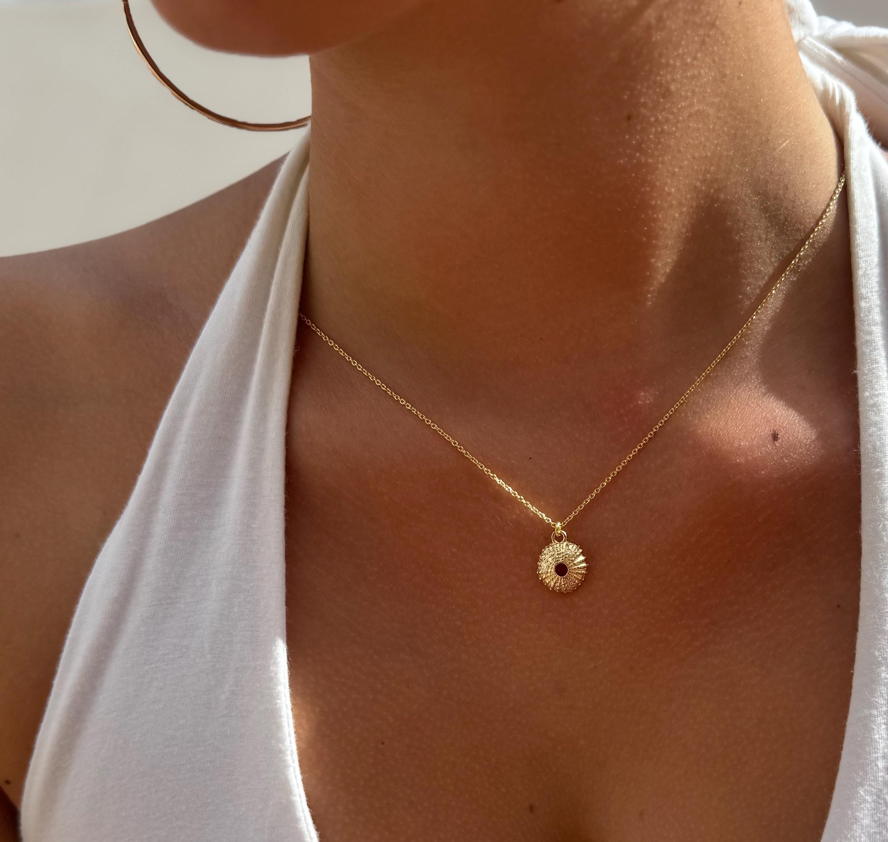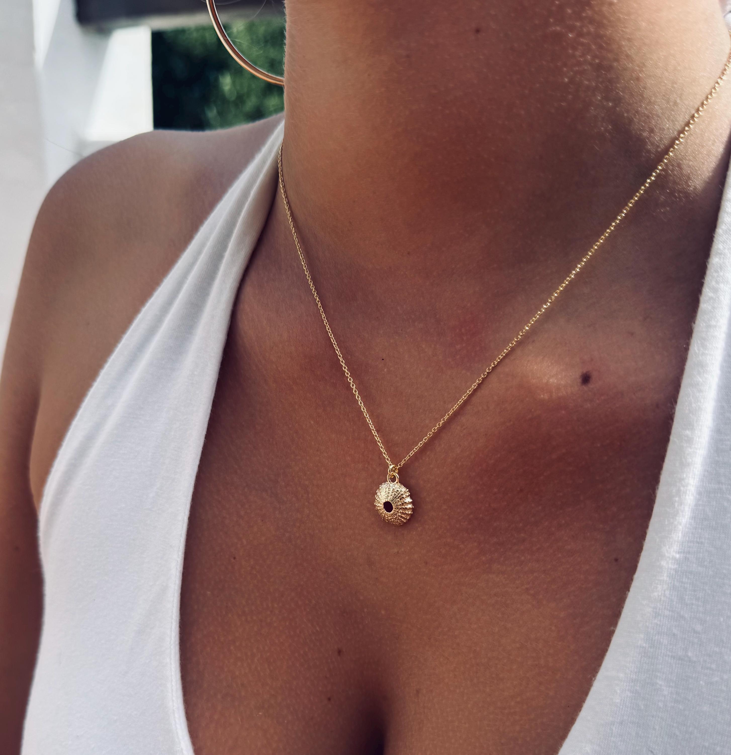 Dainty necklace with a small sea urchin pendant made of high-quality 925 Sterling Silver with 18-carat multi-gold plating. The chain is available in lengths of 40 cm, 45 cm or 50 cm. The piece of jewelry is plated with two layers of gold - a base and a top layer, which increases the durability of the plating.