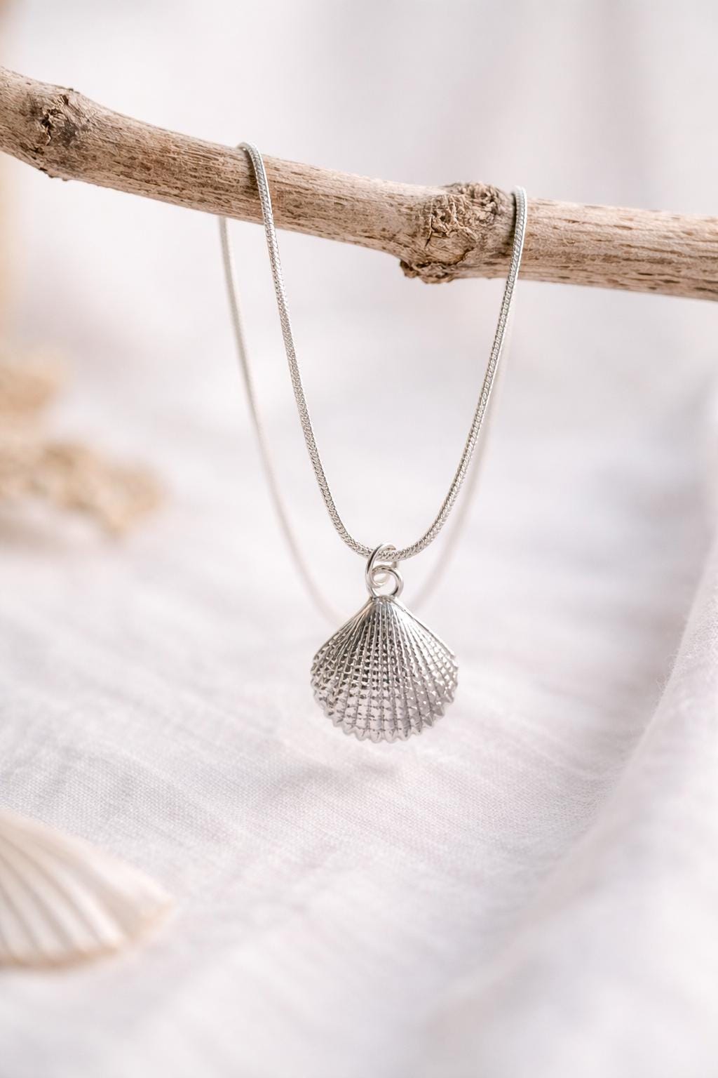 A delicate necklace crafted from 925 sterling silver, featuring a detailed shell pendant – nautical, high-quality, and elegant.