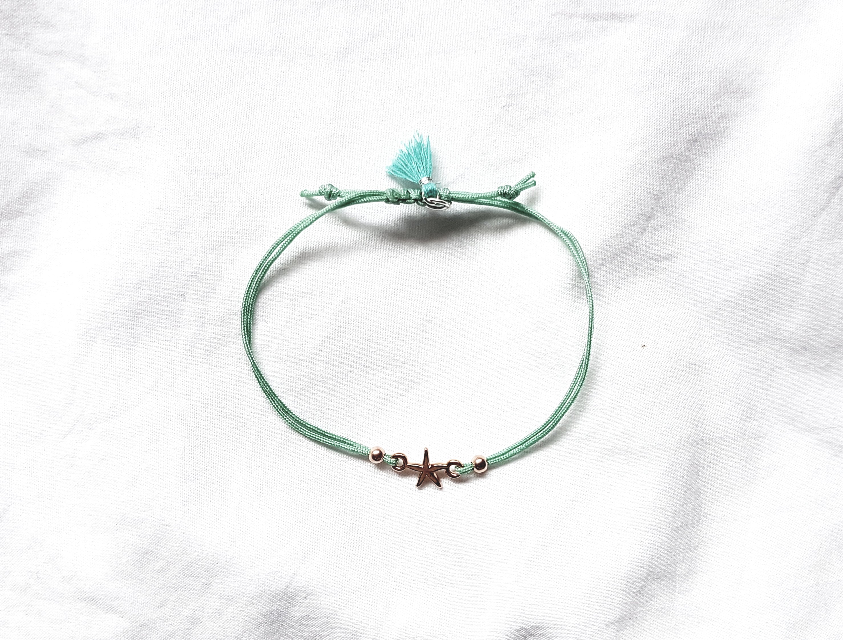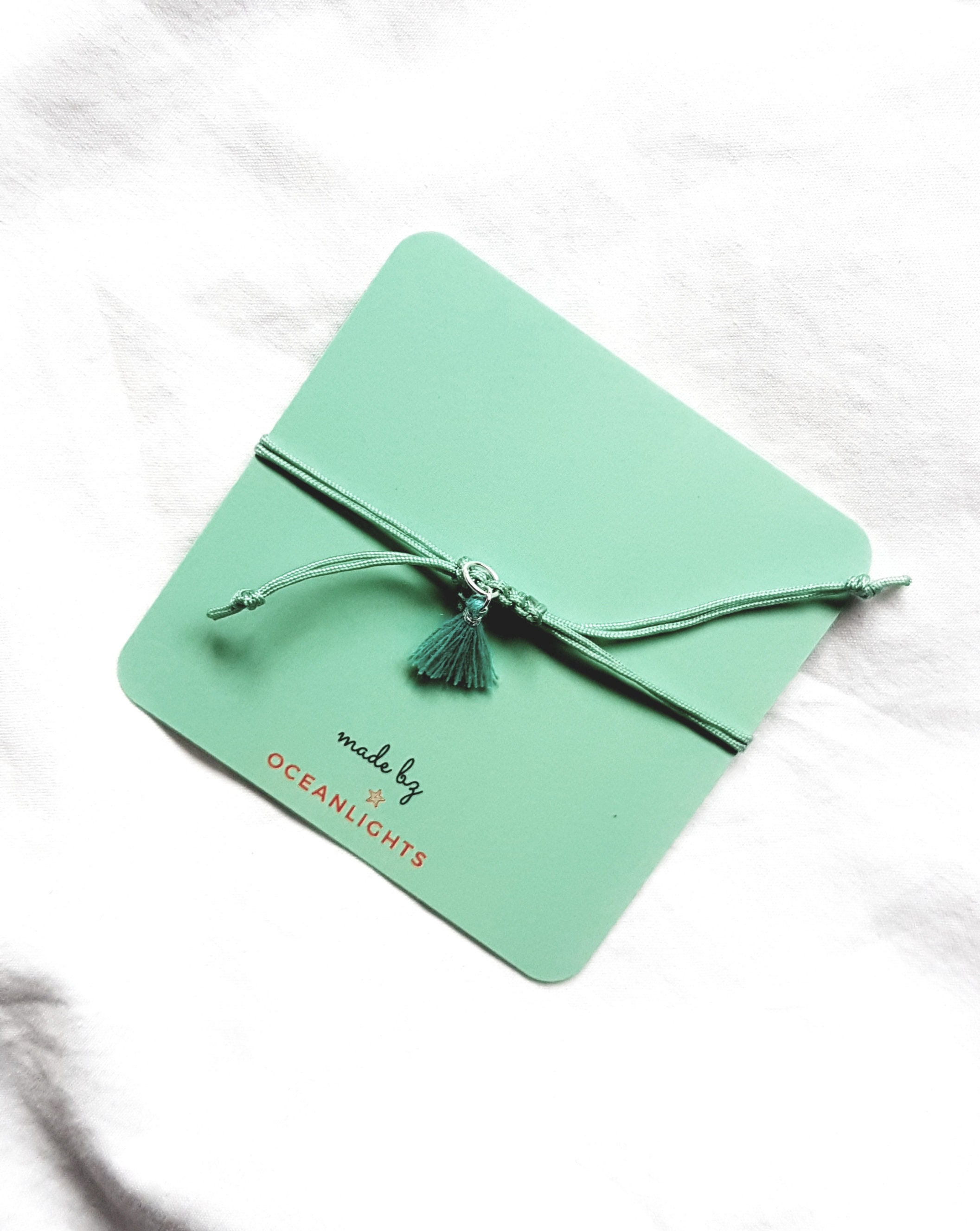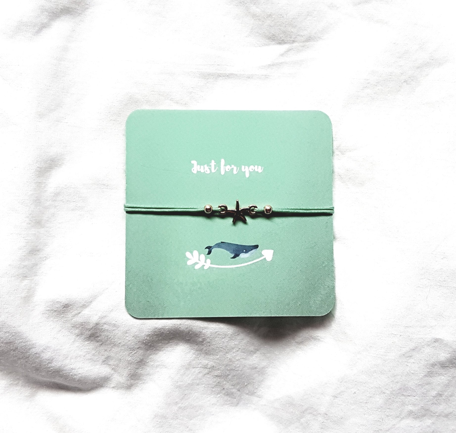 Sweet bracelet with a small starfish connector and gold beads. Turquoise band and tassel. The macrame closure allows for easy adjustment up to 19 cm. The card is available in four different variations (Happy Birthday // Just for you // You make my heart smile // Stay wild at heart).