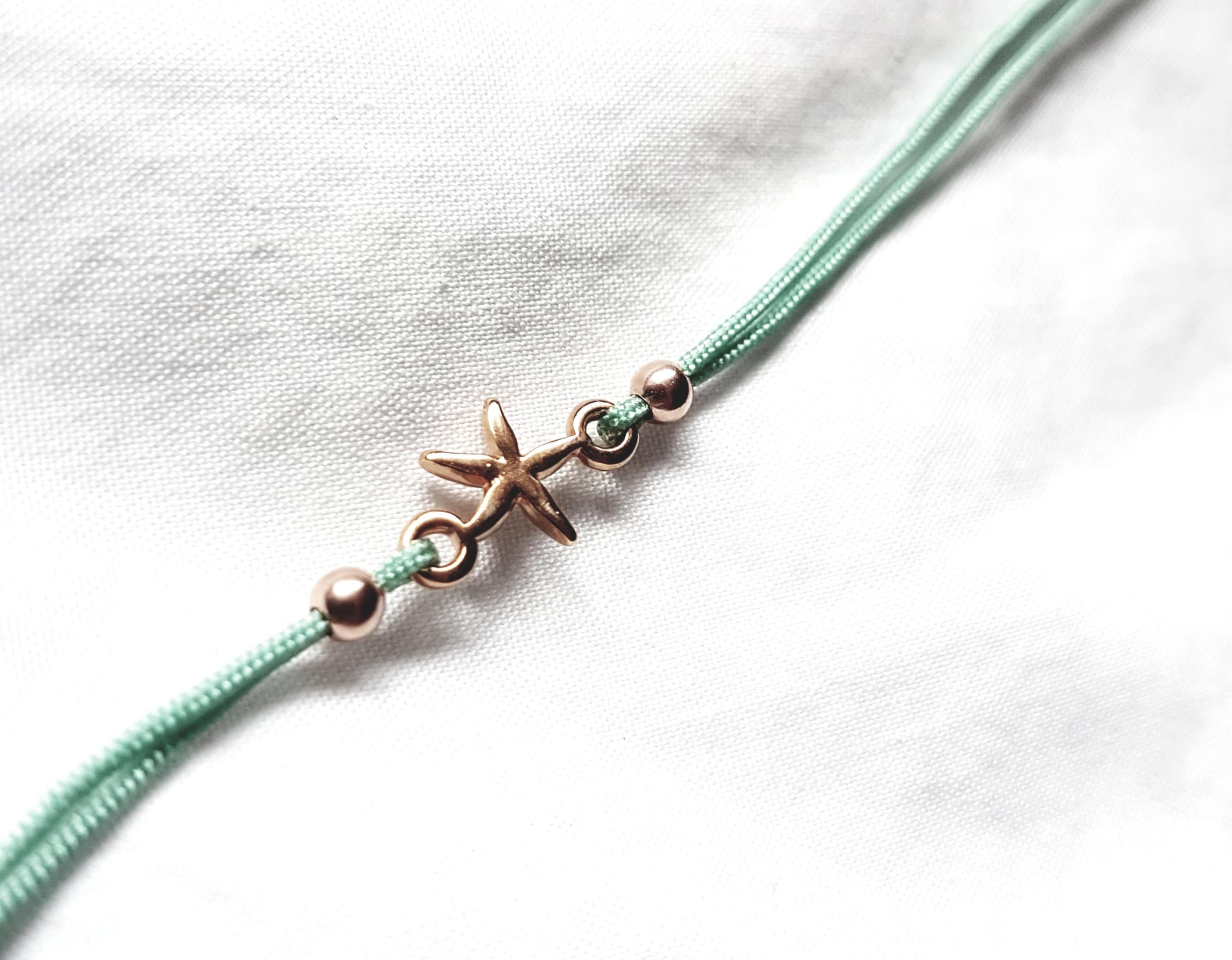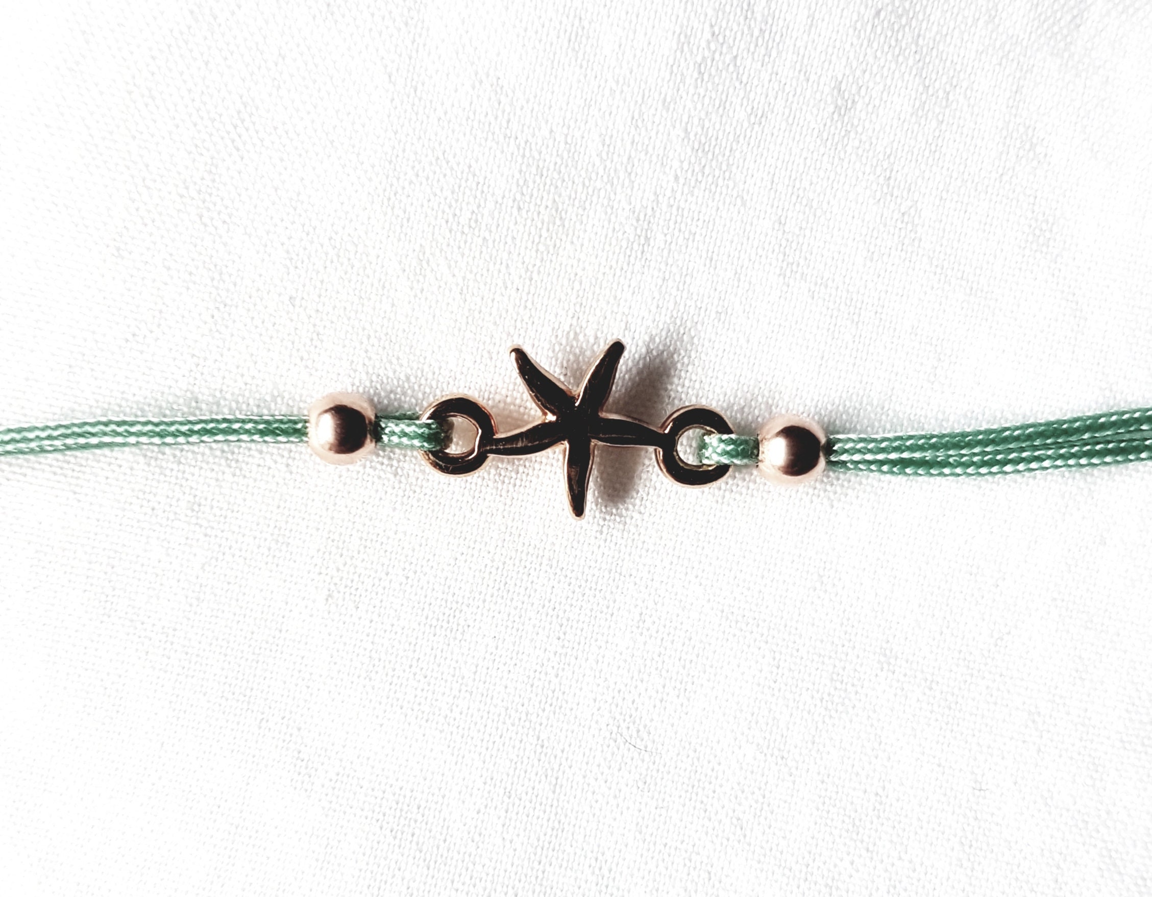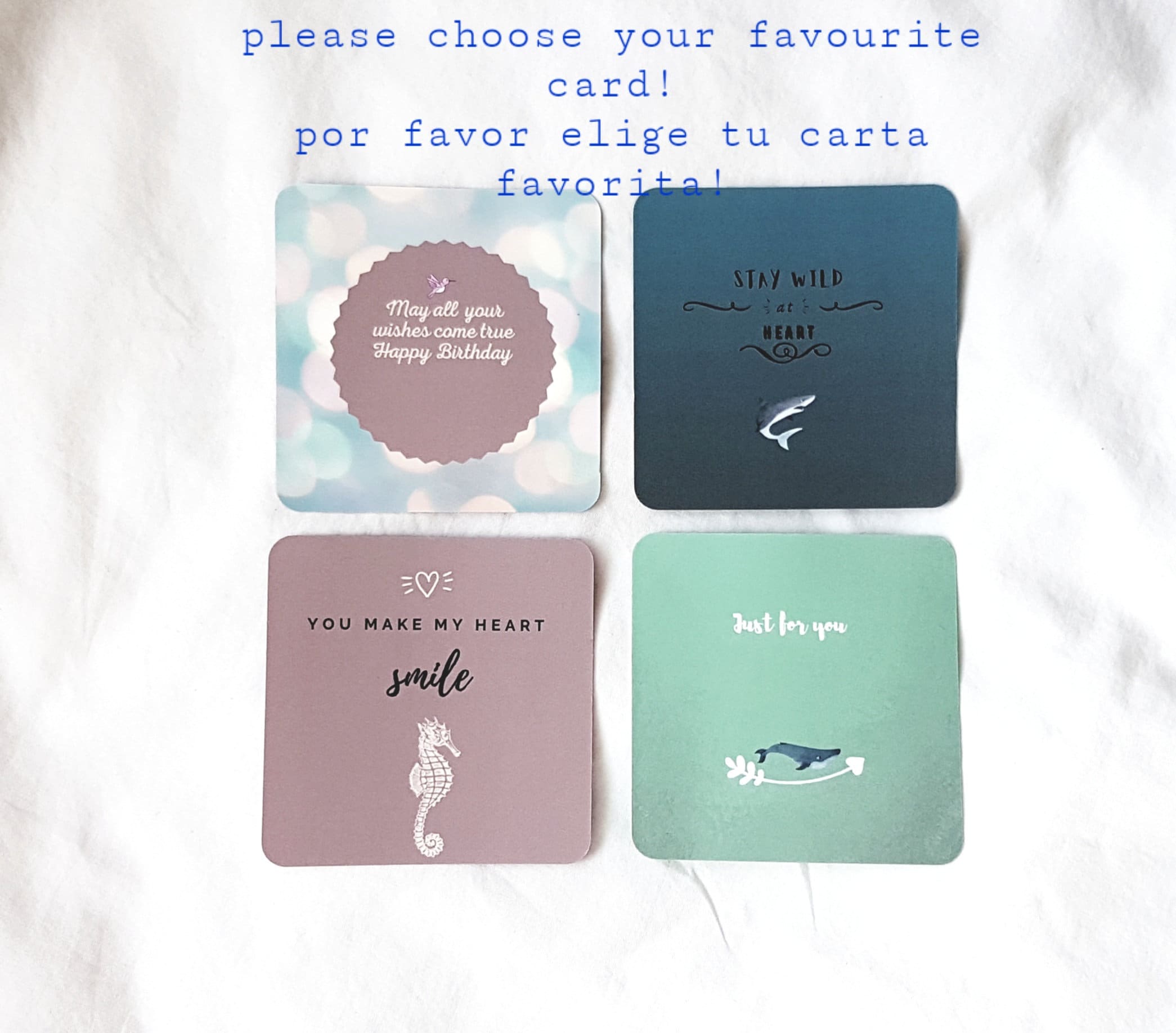 Sweet bracelet with a small starfish connector and gold beads. Turquoise band and tassel. The macrame closure allows for easy adjustment up to 19 cm. The card is available in four different variations (Happy Birthday // Just for you // You make my heart smile // Stay wild at heart).