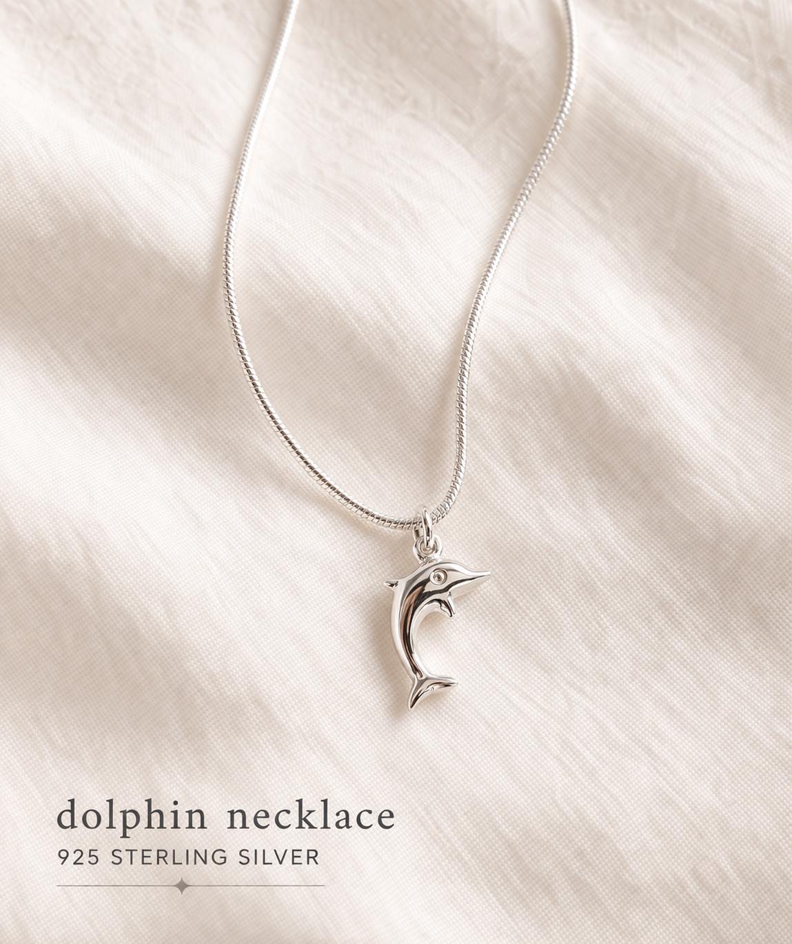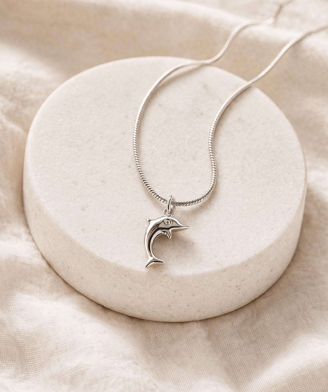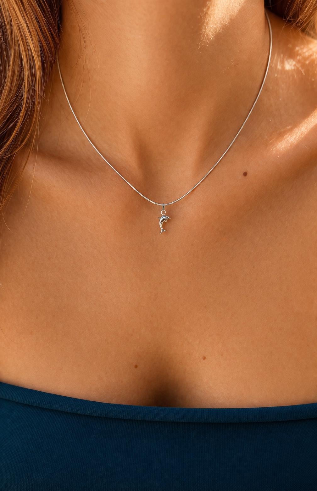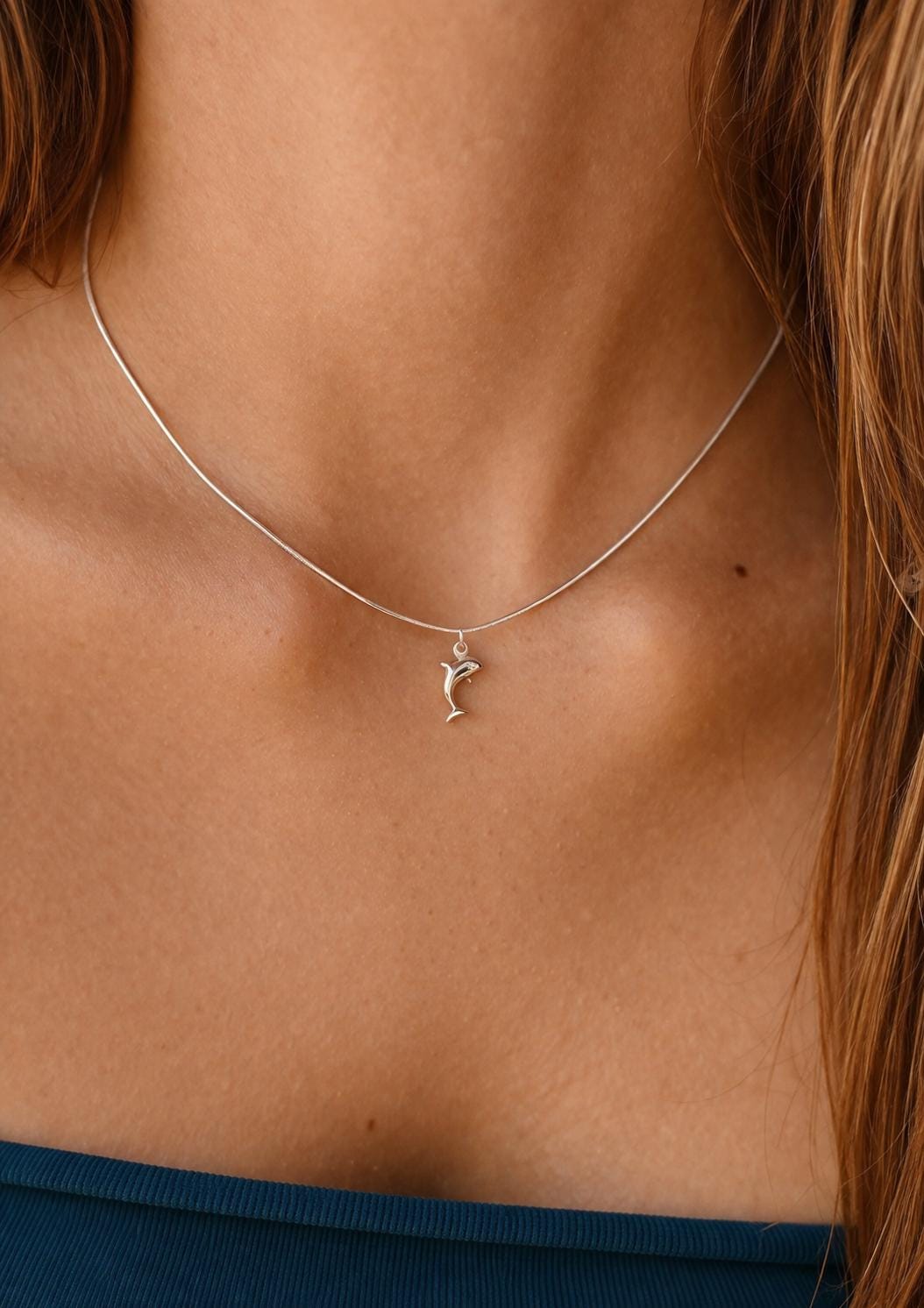 A sterling silver necklace with a dolphin pendant – a light and nautical piece of jewelry, ideal as a gift for women and ocean lovers.