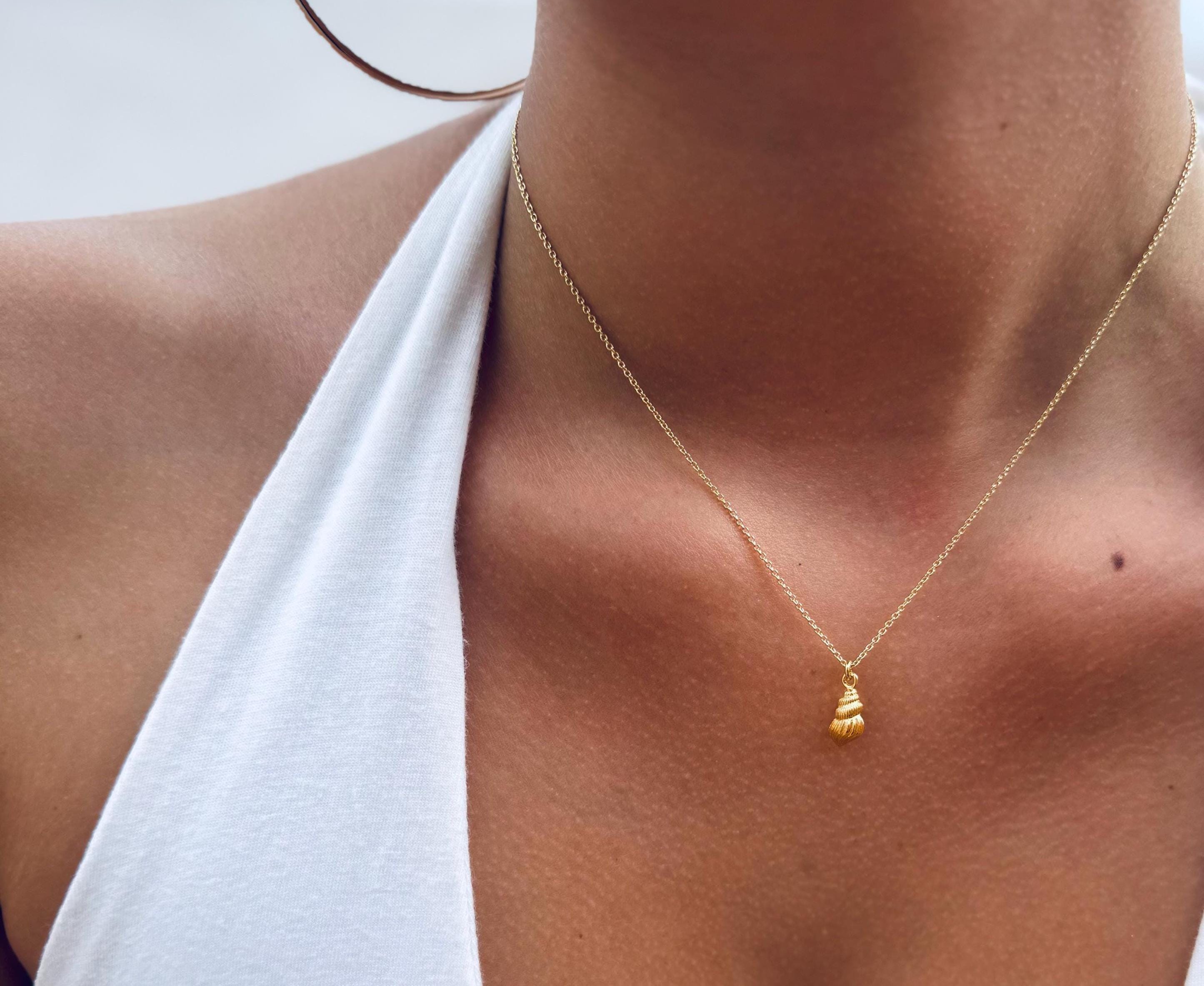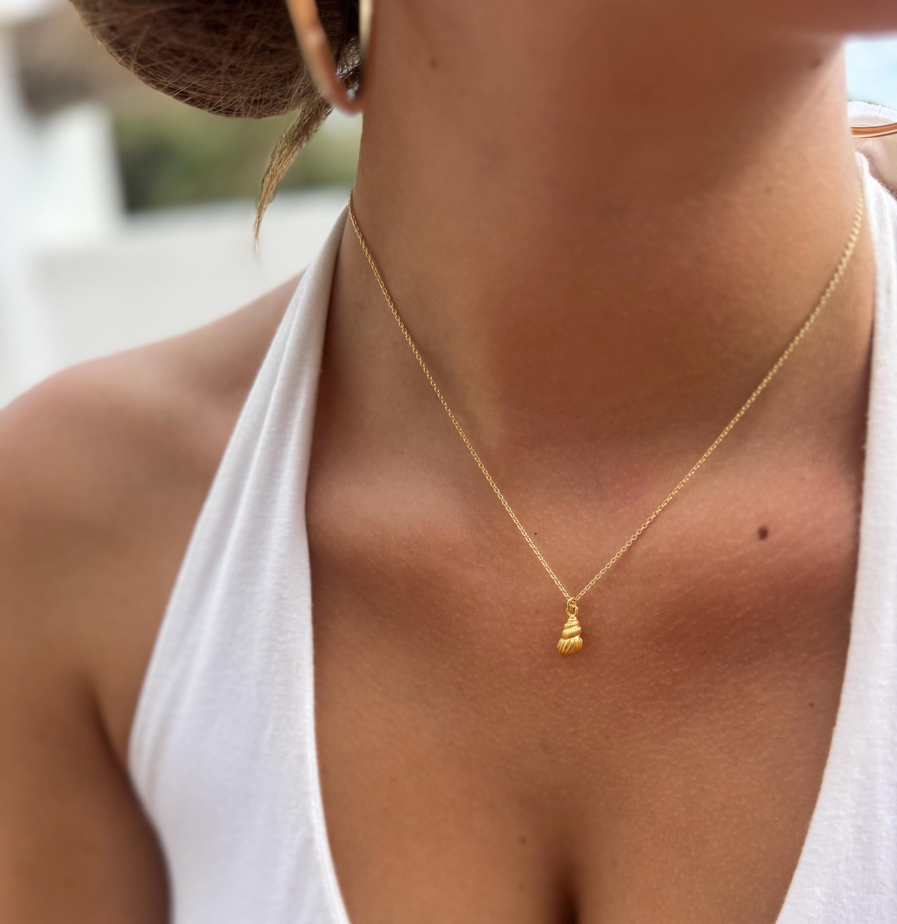 Dainty necklace with a small snail shell. The pendant is made of high-quality 925 sterling silver with 14-karat multi-gold plating. The chain is available in lengths of 40cm, 45cm, and 50cm and comes with a 3cm extension. The piece is plated with two layers of gold – a base and a top layer, which increases the durability of the plating. The pendant measures 11 x 6mm.